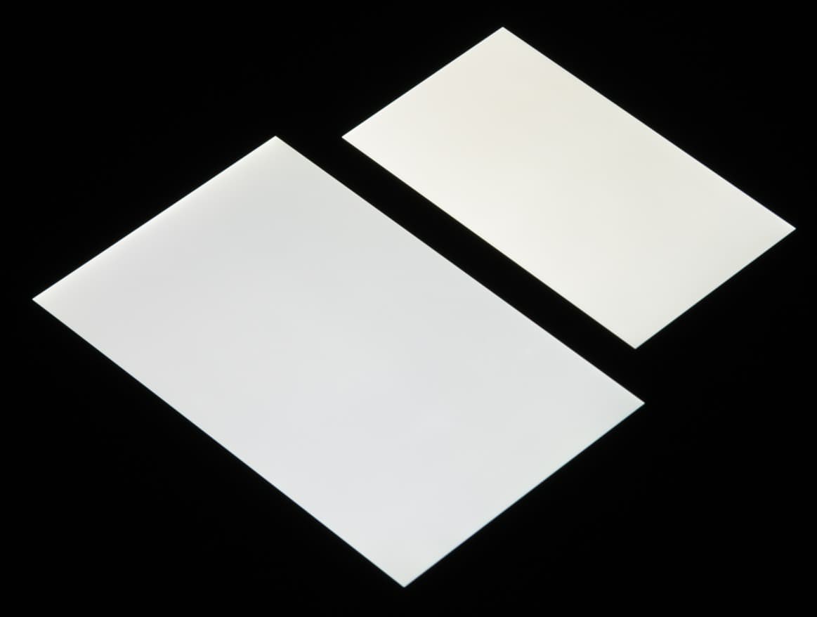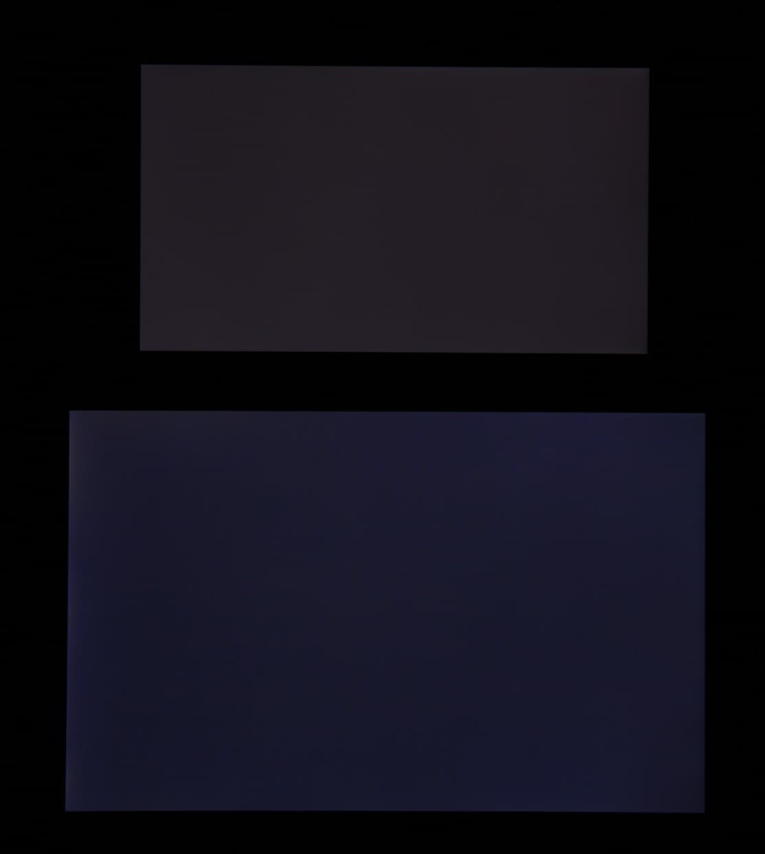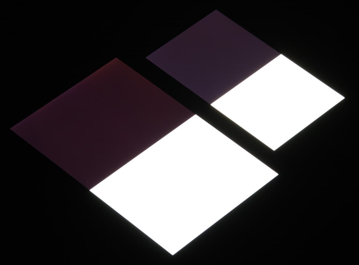 Яркость под углом у обоих экранов заметно уменьшилась (как минимум в 5 раз, исходя из разницы в выдержке), но в случае Sony Xperia XZ Premium падение яркости чуть меньше (яркость по фотографиям 232 против 226 у Nexus 7). Черное поле при отклонении по диагонали высветляется не очень сильно и приобретает фиолетовый оттенок. Фотографии ниже это демонстрируют (яркость белых участков в перпендикулярном плоскости экранов направлении у экранов одинаковая!):