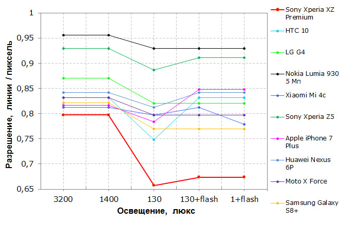 На этот раз мы не стали приводить на графиках разрешение в режиме съемки 12 Мп, поскольку он ничем не отличается от 20 Мп, кроме размера снимка. Если раньше в режиме 8 Мп камера использовала площадь сенсора примерно в 16 Мп, ужимая затем изображение и повышая относительное разрешение, то теперь она не использует подобные хитрости, поэтому искажения геометрии и резкость на краях не улучшаются. Тем не менее, даже простое уменьшение размера снимка до 12 Мп позволит повысить относительное разрешение и детализацию, то есть использовать ту же площадь более эффективно, так что есть смысл снимать не в максимальном разрешении. Впрочем, это верно практически для всех камер смартфонов.