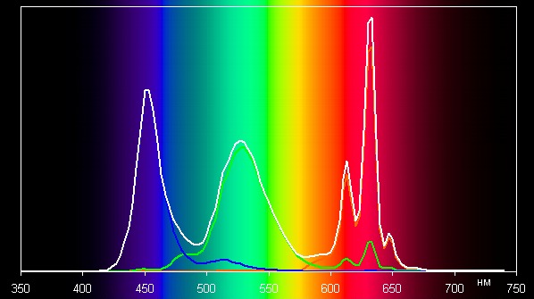 Видно, что охват близок к sRGB. Треугольник чуть кривоват, то есть коррекция не совсем точная, но это уже мелочи. И соответствующий спектр: