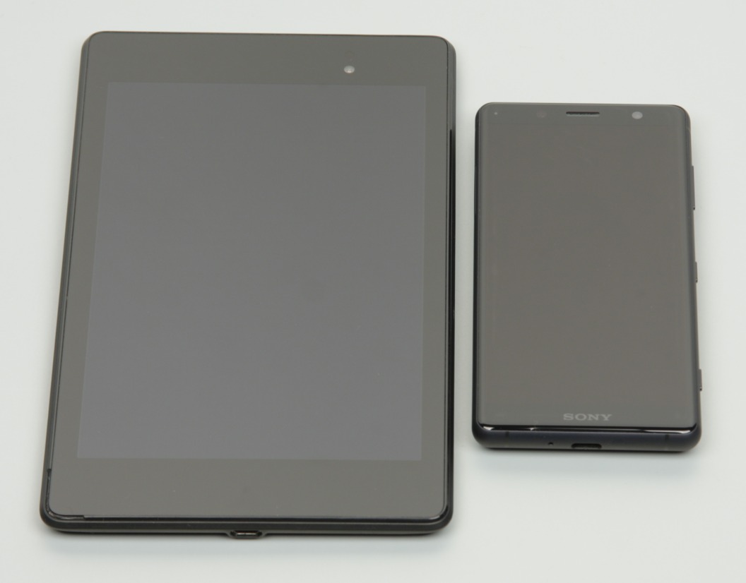 Лицевая поверхность экрана выполнена в виде стеклянной пластины с зеркально-гладкой поверхностью, устойчивой к появлению царапин. Судя по отражению объектов, антибликовые свойства экрана лучше, чем у экрана Google Nexus 7 (2013) (далее просто Nexus 7). Для наглядности приведем фотографию, на которой в выключенных экранах обоих устройств отражается белая поверхность (Sony Xperia XZ2 Compact, как нетрудно определить, справа, далее их можно различать по размеру):