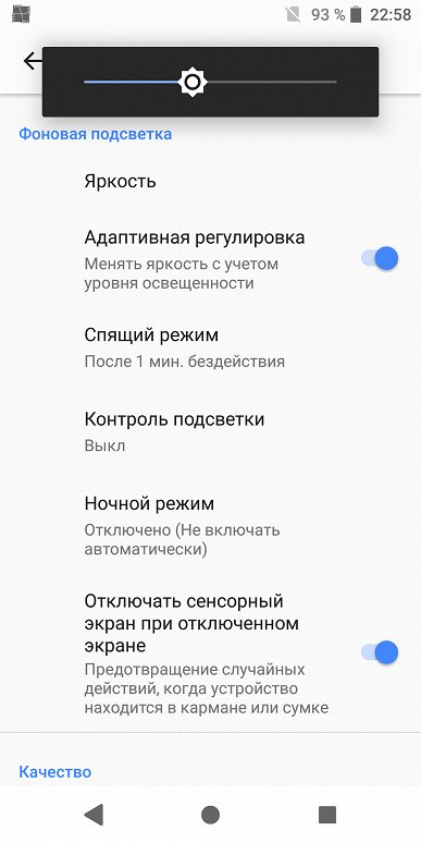 Есть возможность использовать автоматическую подстройку яркости, основанную на работе датчика внешнего освещения. Тесты мультитач диагностируют поддержку 10 одновременных касаний. Поддерживается работа с экраном в перчатках.
