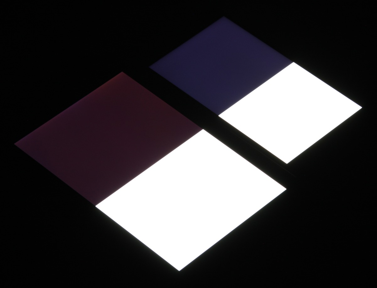 Яркость под углом у обоих экранов заметно уменьшилась (как минимум в 5 раз, исходя из разницы в выдержке), но в случае Sony Xperia XZ2 Premium падение яркости чуть больше. Черное поле при отклонении по диагонали высветляется не очень сильно и приобретает фиолетовый оттенок. Фотографии ниже это демонстрируют (яркость белых участков в перпендикулярном плоскости экранов направлении у экранов одинаковая!):