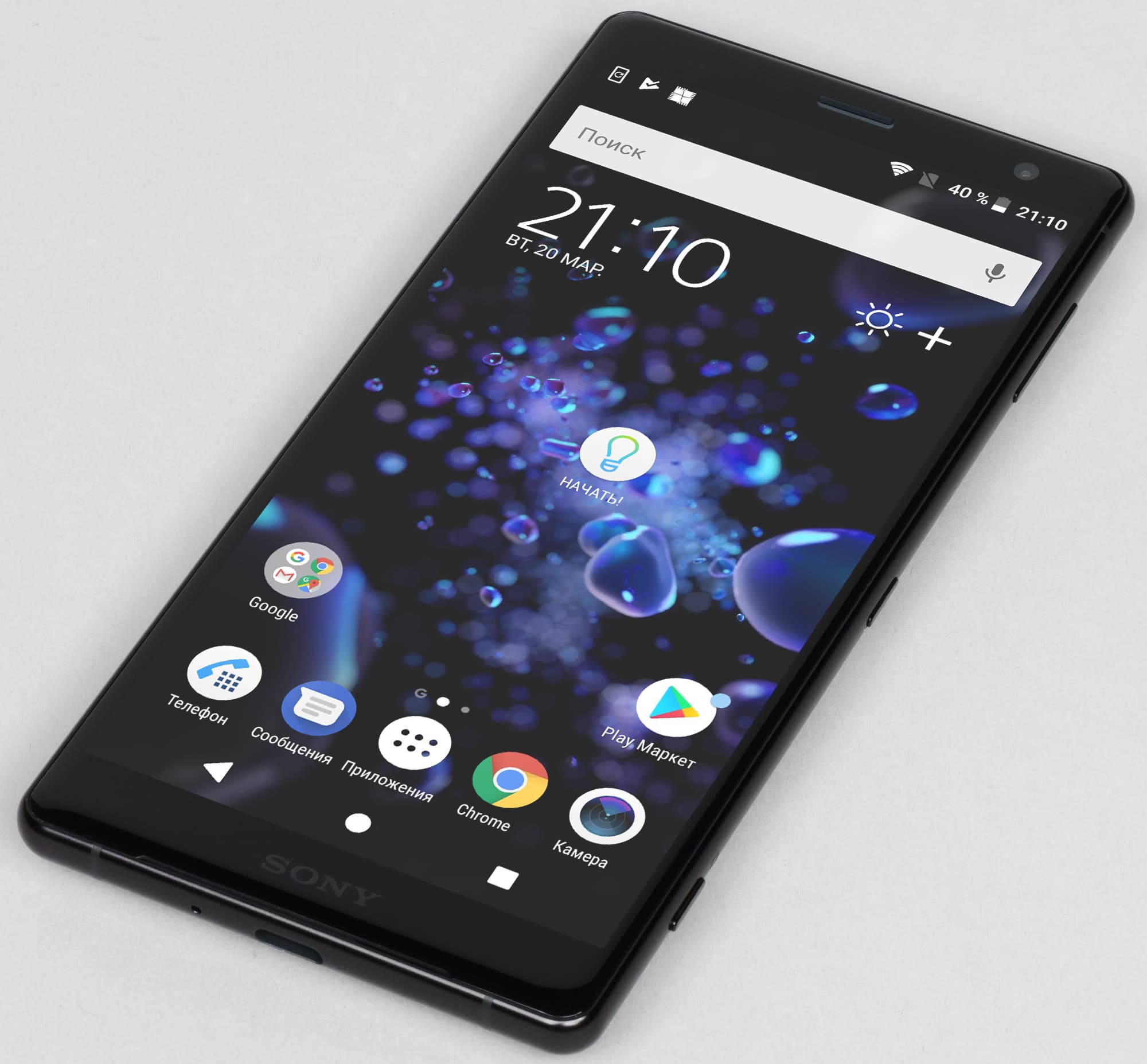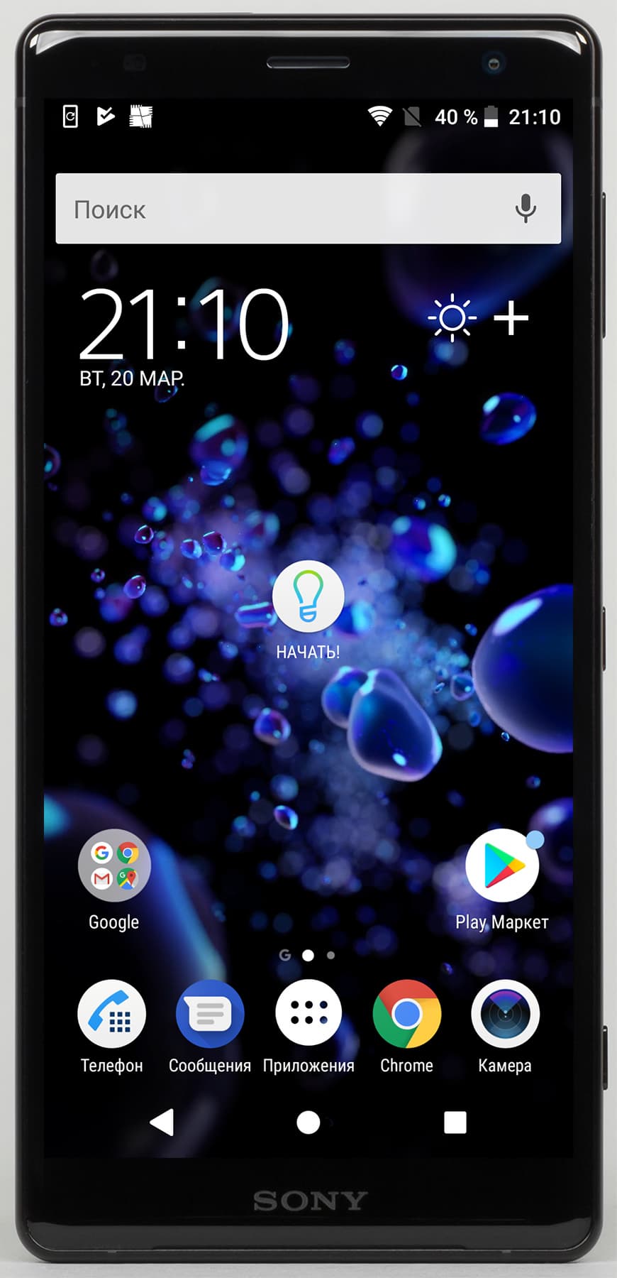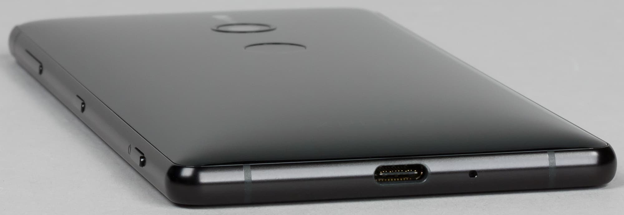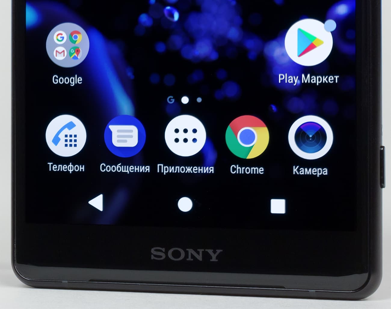 Внизу под экраном нет ни ряда аппаратных кнопок, ни сканера отпечатков пальцев — едва можно разглядеть лишь тонкую щель для выхода звука из основного динамика. Кстати, он работает в стереопаре с верхним (разговорным) динамиком для озвучки музыки, фильмов и игр, это не новость для флагманов Sony.