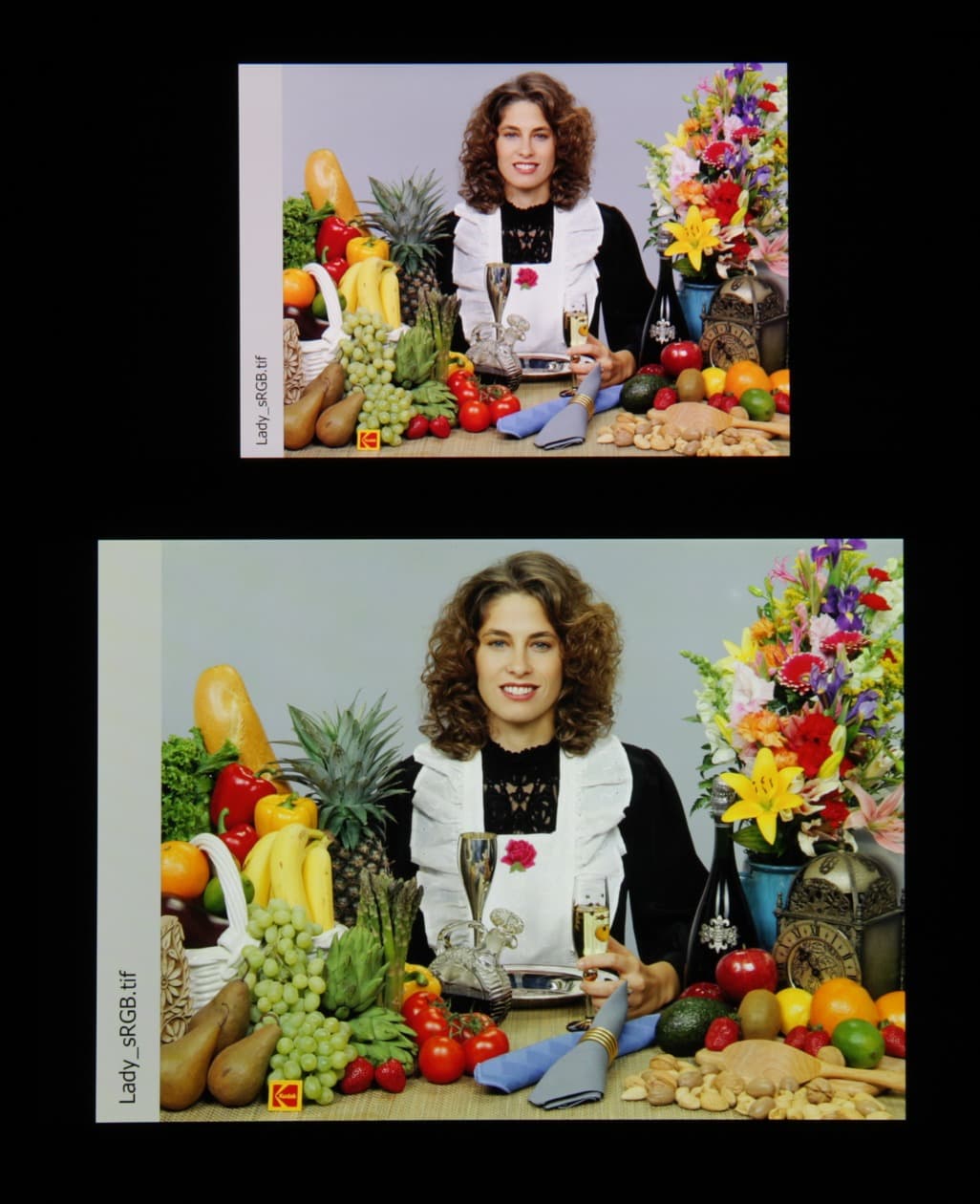 Видно, что перекрестное подмешивание компонент очень мало́, за счет этого и хорошего разделения компонент достигается широкий охват. К сожалению, возможную пользу от этого сильно снижает неуместное завышение цветового контраста и пр. Вот от режима Профессиональный польза точно есть. Так выглядит тестовое изображение после включения данного режима: