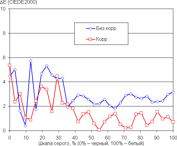 Баланс оттенков на шкале серого приемлемый, так как цветовая температура заметно выше стандартных 6500 К, но отклонение от спектра абсолютно черного тела (ΔE) ниже 10 единиц, что для потребительского устройства считается хорошим показателем (данные, подписанные как Без корр. на графиках ниже). При этом вариация цветовой температуры и ΔE не очень большая — это положительно сказывается на визуальной оценке цветового баланса. (Темные области шкалы серого можно не учитывать, так как там баланс цветов не имеет большого значения, да и погрешность измерений цветовых характеристик на низкой яркости большая.)