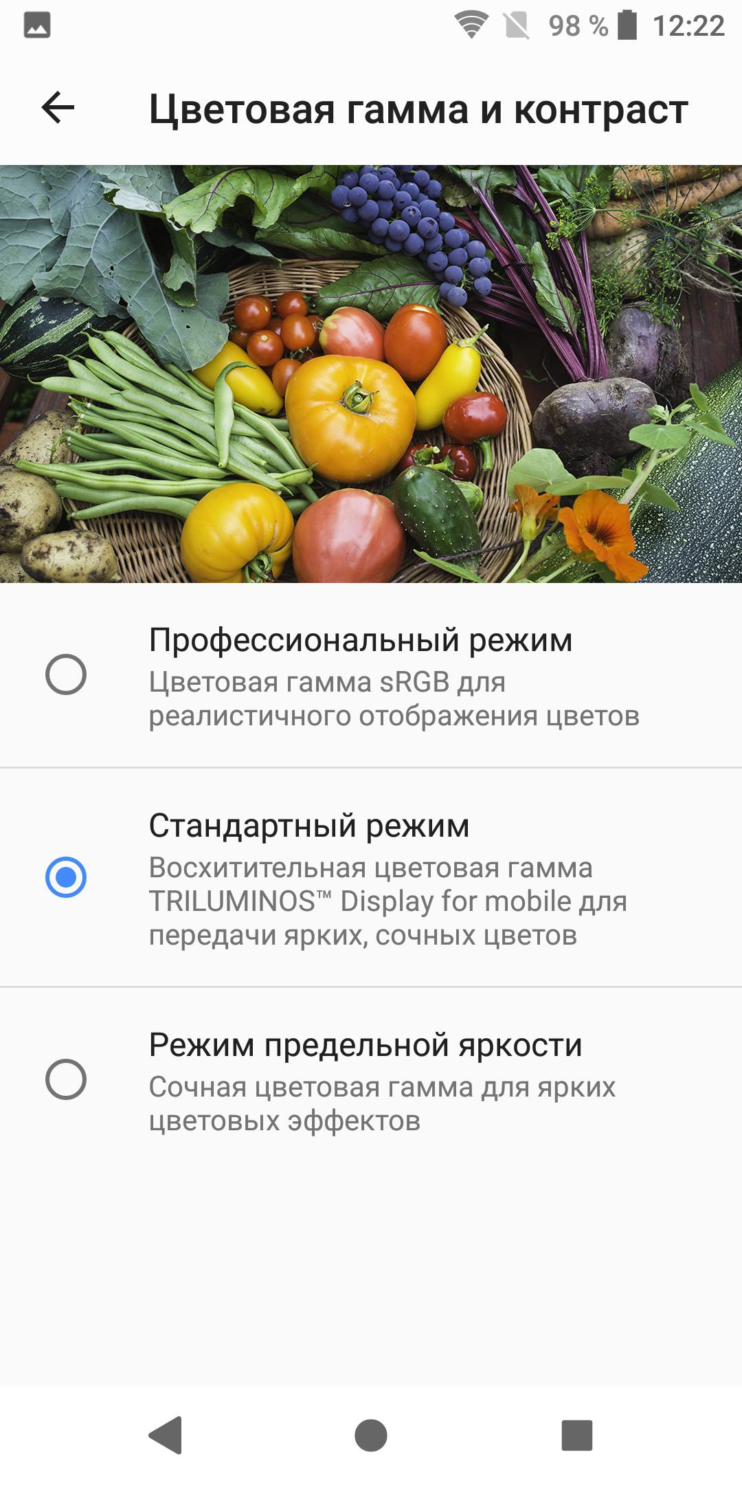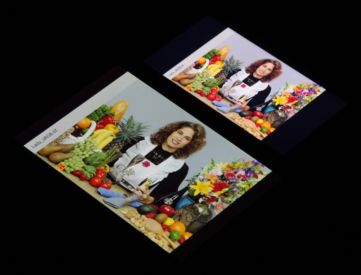 Они типичные для топовых мобильных устройств Sony (и не только). По всей видимости, в этом экране используются светодиоды с синим излучателем и зеленым и красным люминофором (обычно — синий излучатель и желтый люминофор), что в сочетании со специальными светофильтрами матрицы и позволяет получить широкий цветовой охват. Да, и в красном люминофоре, видимо, используются так называемые квантовые точки. К сожалению, в итоге цвета изображений — рисунков, фотографий и фильмов, — ориентированных на пространство sRGB (а таких подавляющее большинство), имеют неестественную насыщенность. Особенно это заметно на узнаваемых оттенках, например на оттенках кожи. Результат приведен на фотографиях выше.