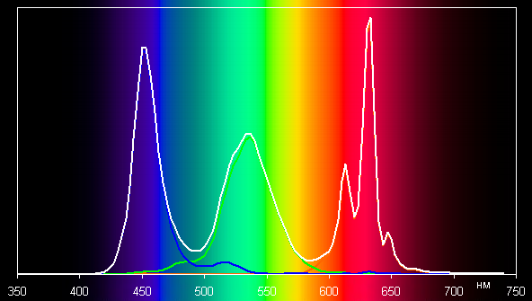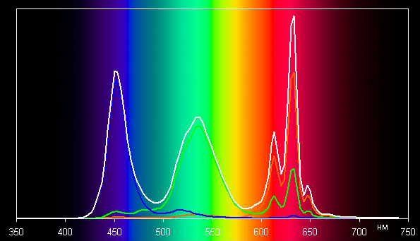 Видно, что охват близок к sRGB. Треугольник чуть кривоват, то есть коррекция не совсем точная, но это уже мелочи. И соответствующий спектр: