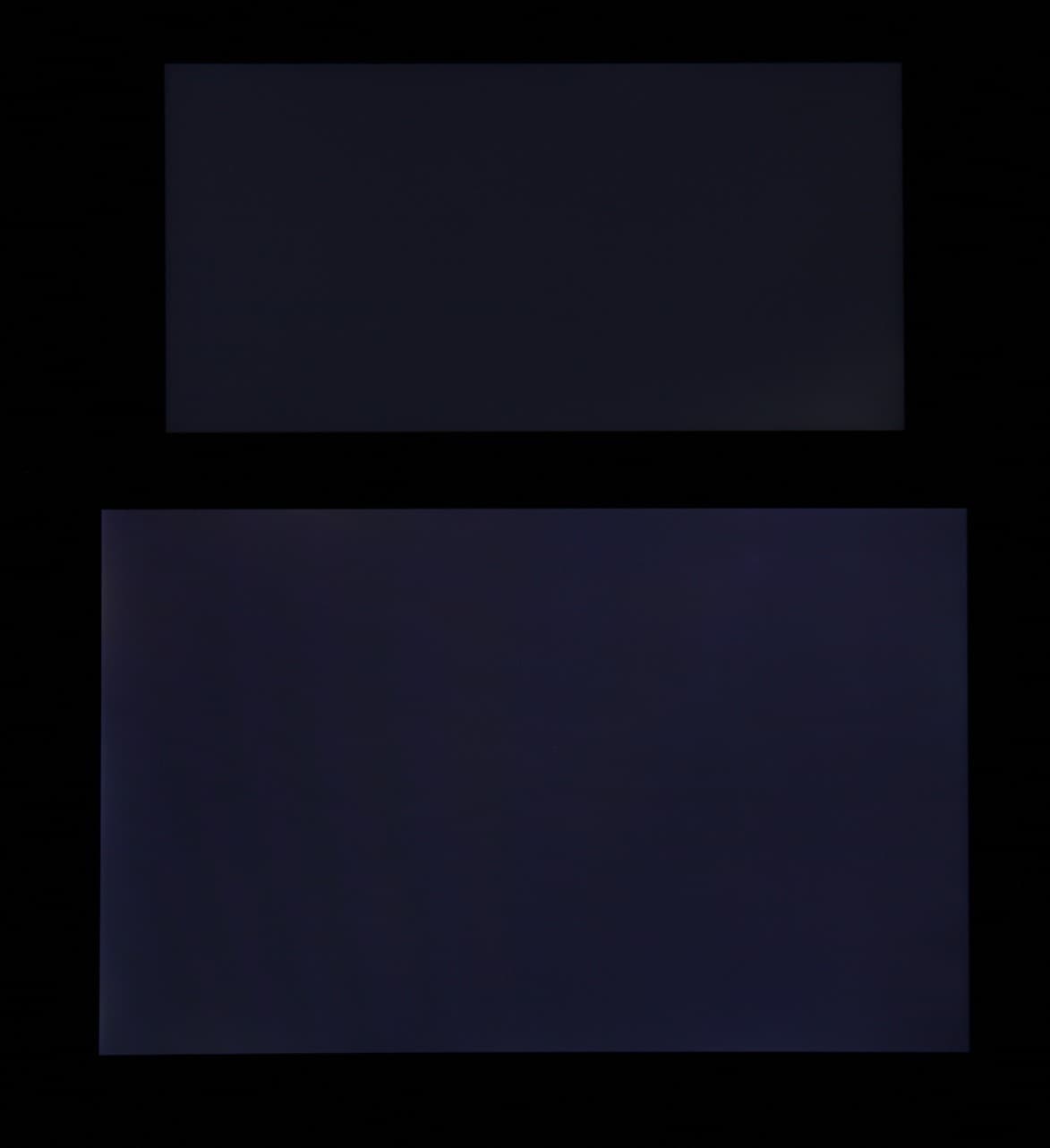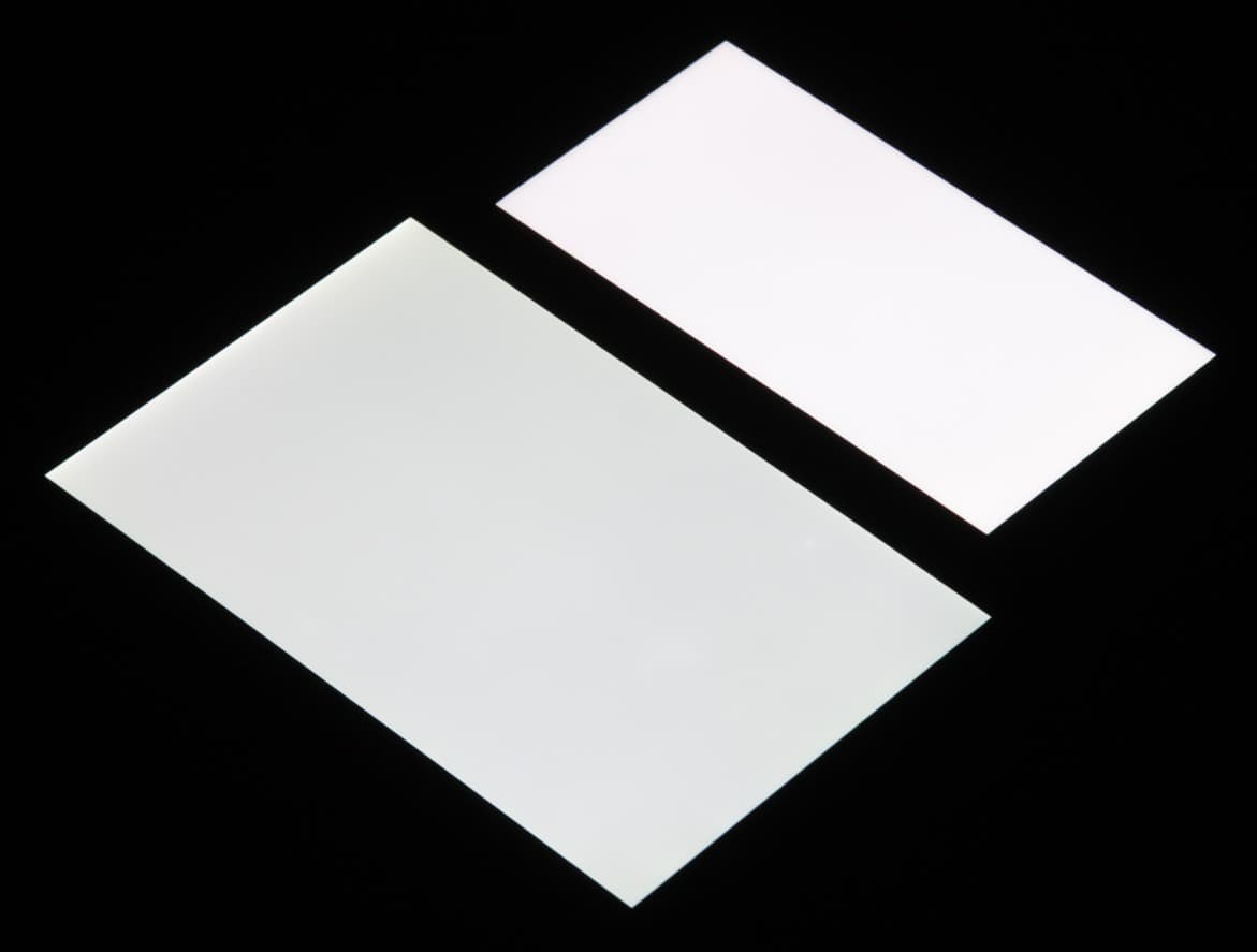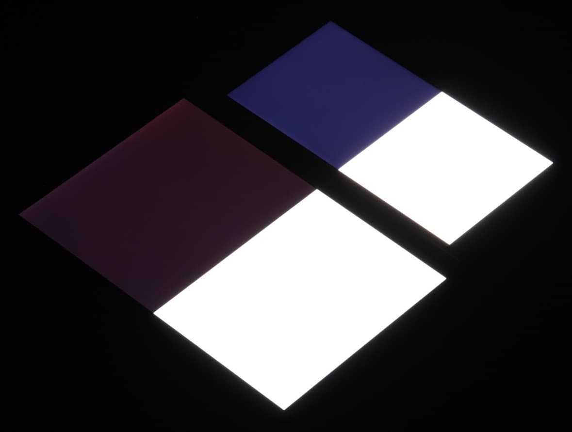 Яркость под углом у обоих экранов заметно уменьшилась, но в случае Sony Xperia XZ2 падение яркости меньше. Черное поле при отклонении по диагонали высветляется в средней степени и приобретает фиолетовый оттенок. Фотографии ниже это демонстрируют (яркость белых участков в перпендикулярном плоскости экранов направлении у экранов одинаковая!):