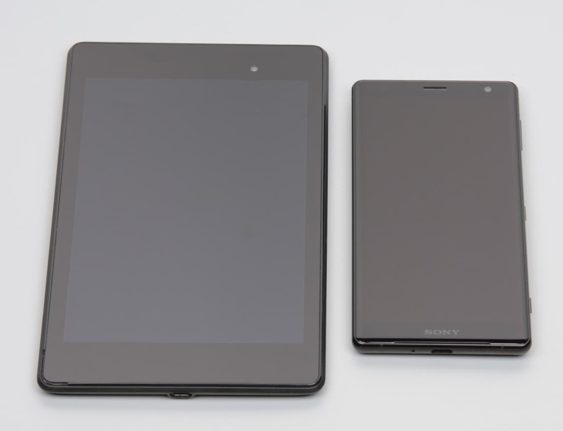 Лицевая поверхность экрана выполнена в виде стеклянной пластины с зеркально-гладкой поверхностью, устойчивой к появлению царапин. Судя по отражению объектов, антибликовые свойства экрана лучше, чем у экрана Google Nexus 7 (2013) (далее просто Nexus 7). Для наглядности приведем фотографию, на которой в выключенных экранах обоих устройств отражается белая поверхность (Sony Xperia XZ2, как нетрудно определить, справа, далее их можно различать по размеру):