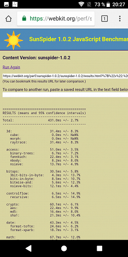 Что касается бенчмарков для оценки скорости движка javascript, то стоит всегда делать скидку на то, что в них результаты существенно зависят от браузера, в котором запускаются, так что сравнение может быть истинно корректным только на одинаковых ОС и браузерах, а такая возможность имеется при тестировании не всегда. В случае с ОС Android мы всегда стараемся использовать Google Chrome.