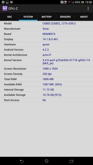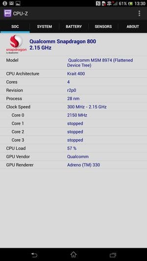 Аппаратная платформа Sony Xperia Z Ultra строится на базе однокристальной системы (SoC) Qualcomm Snapdragon 800. Центральный процессор здесь имеет 4 ядра Krait 400, работающих на частоте 2,2 ГГц (CPU-Z показывает 2,15 ГГц). Оперативной памяти в устройстве предусмотрено 2 ГБ, а хранилище, доступное пользователю для загрузки собственных файлов, составляет чуть больше 11 ГБ из номинально обозначенных 16 ГБ. Есть поддержка карт памяти microSD объемом до 64 ГБ, так что недостатка в памяти пользователь не ощутит. Поддержку в обработке графики процессору оказывает самый современный видеоускоритель Adreno 330.