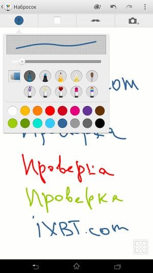 Самый интересный момент, который стоит упомянуть в данном разделе статьи и который делает модель Sony Xperia Z Ultra уникальной в своей линейке — это возможность работы со стилусом или любым другим предметом с токопроводящим наконечником. Любопытно, что если открыть панель уведомлений, делая смахивание вниз не пальцем, а именно грифелем карандаша, то в ней уже будет присутствовать меню для работы со стилусом — такой вот «интеллектуальный» диалог. При выборе соответствующей программы появляется набор инструментов для рисования и рукописного ввода. Здесь можно выбрать кисти, краски, цвета, толщину линий, фактуру и т. д. Функциональность напоминает таковую у знаменитого Samsung Galaxy Note, только гораздо скромнее, и так же, как и там, быстрая запись длинных текстов невозможна ввиду задержки (лага) между прикосновением и появлением черты на экране. В этой программе можно лишь неспеша что-то нарисовать, и то очень простенькое, или накарябать пару фраз текста, но они будут не слишком разборчивы. Для быстрого ручного конспектирования лекций и семинаров Sony Xperia Z Ultra никак не подходит.
