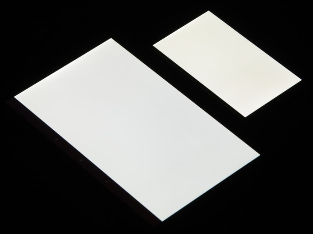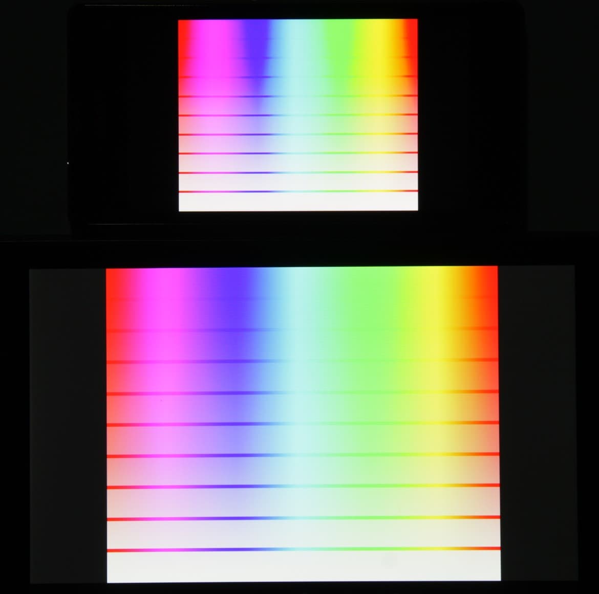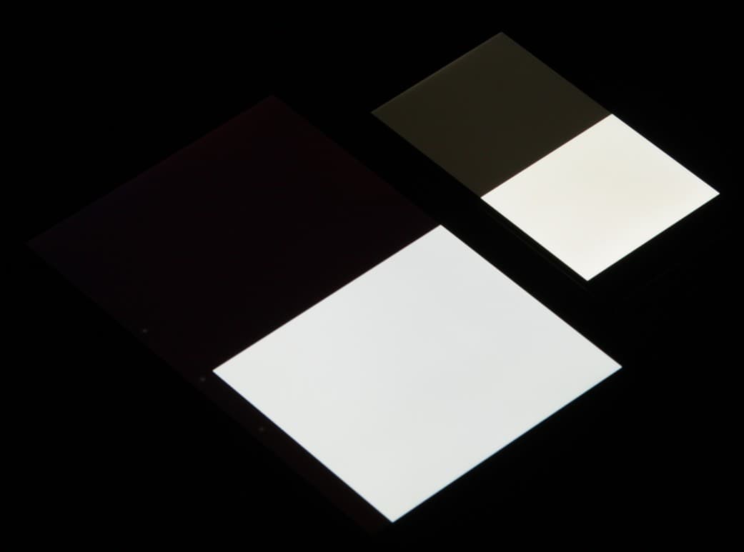 Экран имеет хорошие углы обзора без значительного сдвига цветов и без инвертирования оттенков даже при больших отклонениях от перпендикуляра к экрану. Для сравнения приведем фотографии, на которых на экраны тех же двух устройств выведены одинаковые изображения, при этом яркость экранов установлена примерно на 200 кд/м². Перпендикулярно к экранам тестовая картинка: