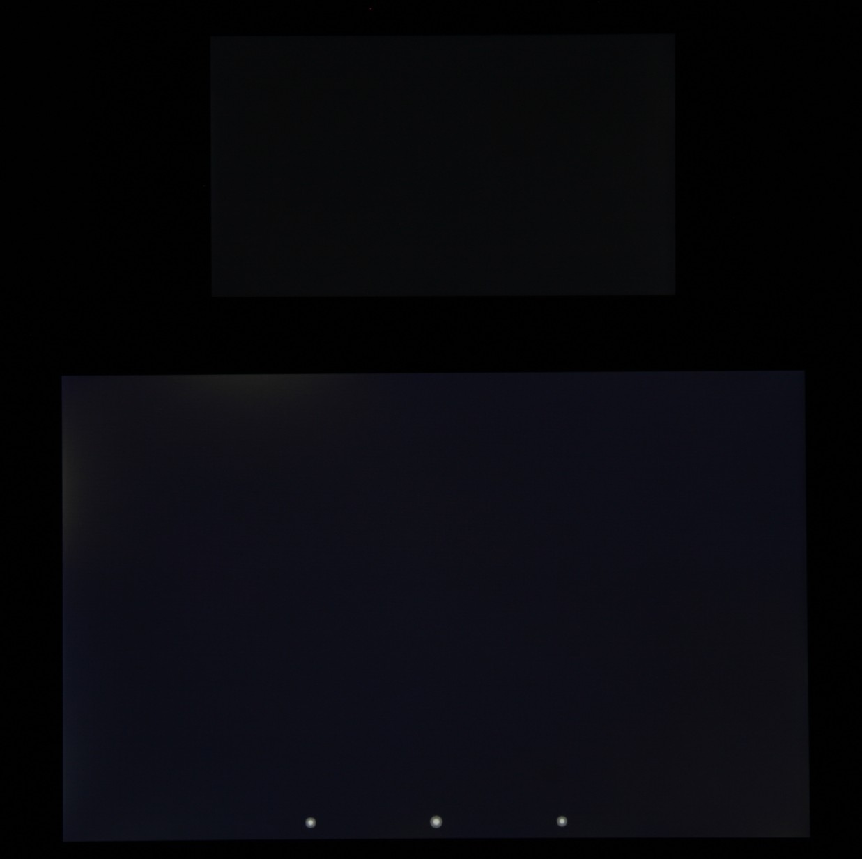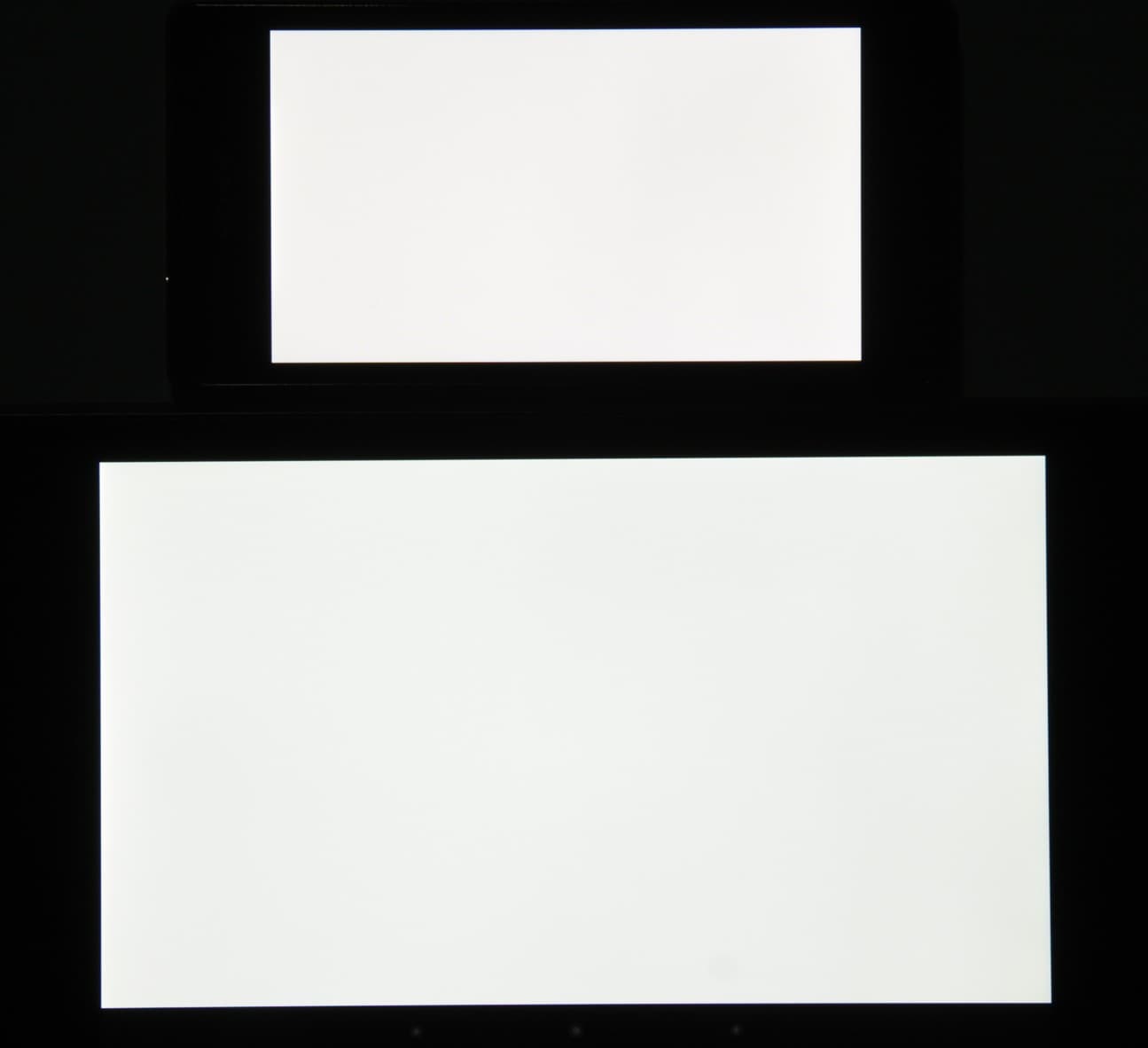 Яркость под углом у экранов уменьшилась (как минимум в 4 раза, исходя из разницы в выдержке), но в случае Z1 Compact падение яркости немного меньше, чем у Nexus 7 (яркость по фотографиям 234 против 228). Черное поле при отклонении по диагонали высветляется сильно, но остается почти нейтрально-серым. Фотография ниже это показывает (яркость белых участков в перпендикулярном направлении у экранов одинаковая!):