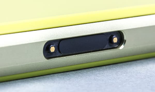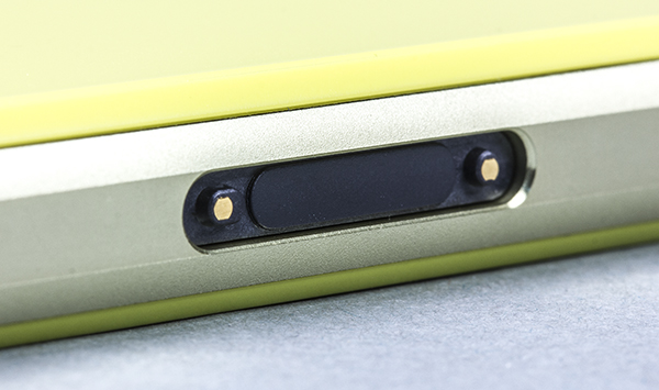 На левой боковой грани расположена открытая контактная группа для соединения с разъемом док-станции — такой элемент встречается у многих современных смартфонов Sony. Такой вариант ежедневной подзарядки телефона удобен для тех, кто не желает каждый день открывать-закрывать крышку разъема Micro-USB. Правда, подставку придется докупать отдельно — док-станция DK32 в штатную комплектацию устройства не входит.