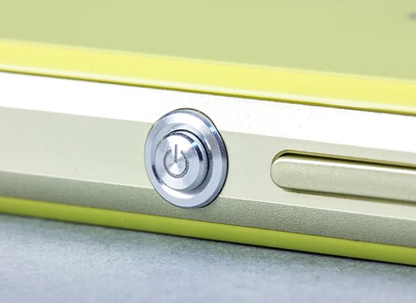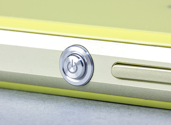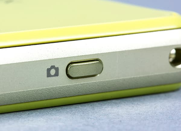 Рядом с фотокнопкой в непосредственной близи расположена клавиша питания и блокировки — этот блестящий серебристым металлом кругляш уже стал фирменной визитной карточкой мобильных телефонов Sony. Кнопка блокировки расположена на расстоянии в 50 мм от верхнего торца корпуса устройства, а расположенная неподалеку от нее двухпозиционная качель регулировки громкости — на расстоянии 55 мм от нижнего, полная длина корпуса составляет 127 мм.