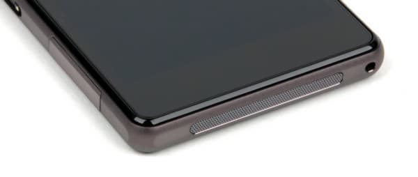 Окошко фронтальной камеры и глазки сенсоров спрятаны под стеклом в верхней части над экраном рядом с логотипом, а вот снизу здесь совсем ничего нет. Привычные аппаратные кнопки управления под экраном давно переехали во всех смартфонах Sony на сам дисплей в виде программных иконок Android 4.х, так что места под экраном оставлено немного — только для того, чтобы можно было ухватиться пальцами.