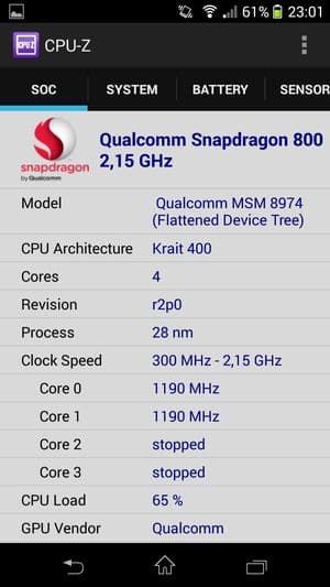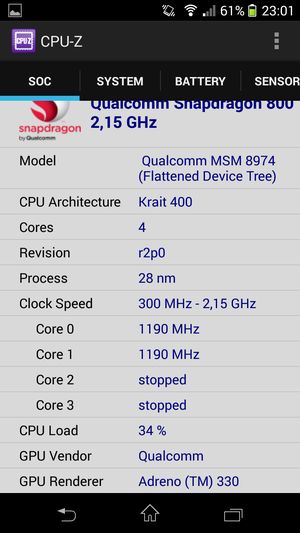 - SoC Qualcomm Snapdragon 800 (MSM8974), 2,2 ГГц, 4 ядра Krait 400