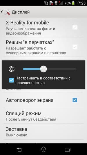 Яркость дисплея имеет как ручную, так и автоматическую регулировку, последняя основывается на работе датчика освещения. Имеется у смартфона и датчик приближения, который блокирует экран при поднесении смартфона к уху. Технология мультитач позволяет обрабатывать восемь одновременных прикосновений. Экран смартфона Sony Xperia Z1 Compact чувствителен к прикосновению в перчатках, а также мокрыми пальцами, благодаря чему аппарат оказывается применим практически в любой ситуации.