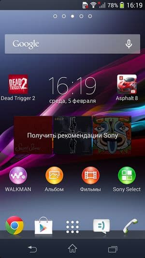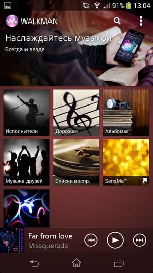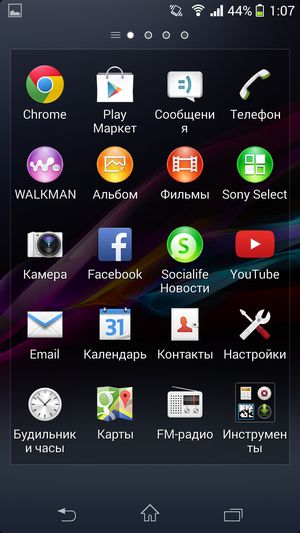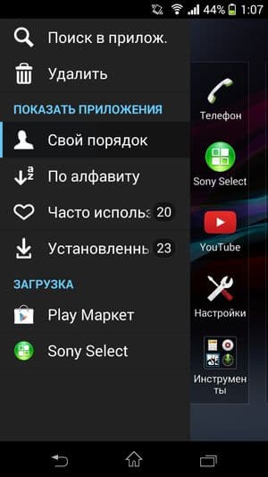 Sony Xperia Z1 Compact работает в данный момент на программной платформе Google Android версии 4.3. Поверх стандартного интерфейса ОС компания установила собственный пользовательский интерфейс, значительно видоизменяющий и дополняющий стандартный. Основная отличительная черта меню программ — широкие возможности по сортировке, выборке и работе с иконками установленных приложений. Для работы с ними здесь появилась даже целая контекстная панель, выдвигающаяся слева боковым взмахом. В ней можно осуществлять поиск по категориям, задавать свое собственное, произвольное расположение иконок, либо отсортировать несколькими предустановленными способами. Очень удобно, что прямо здесь же можно и удалить любое приложение без необходимости заходить в специальный раздел основного меню — функциональность, частично заменяющая файловый менеджер. Естественно, поддерживается возможность создания папок, но для этого нужно содержать иконки в режиме «свой порядок», иначе все рассортированные по папкам приложения опять распределятся по рабочим столам, в алфавитном порядке, например.