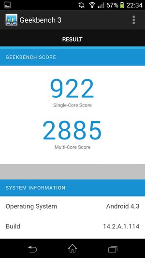 Аппаратная платформа Sony Xperia Z1 Compact строится на базе одной из наиболее мощных на сегодняшний день мобильных платформ — однокристальной системе (SoC) Qualcomm Snapdragon 800. Центральный процессор здесь имеет 4 ядра Krait 400, работающих на частоте 2,2 ГГц (CPU-Z показывает 2,15 ГГц). Оперативной памяти в устройстве предусмотрено 2 ГБ, а хранилище, доступное пользователю для загрузки собственных файлов, составляет чуть больше 11 ГБ из номинально обозначенных 16 ГБ. Есть поддержка карт памяти microSD объемом до 64 ГБ, так что недостатка в памяти пользователь не ощутит. Поддержку в обработке графики процессору оказывает самый современный видеоускоритель Adreno 330. Ко всему прочему аппарат поддерживает режим подключения внешних флэш-накопителей (OTG), так что файлы можно открывать и просматривать прямо с подключенной к нему через специальный переходник флэшки.