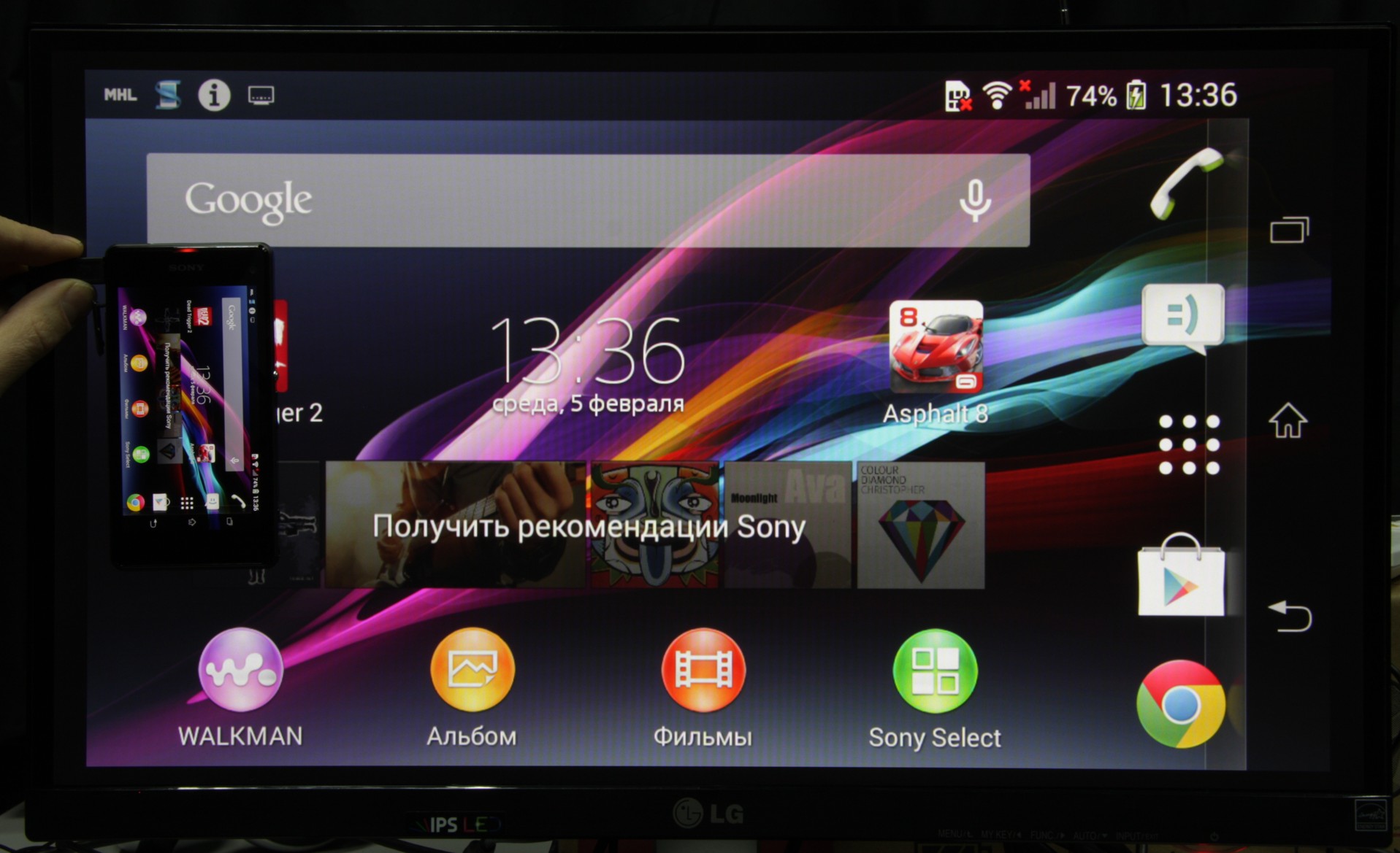 Дополнительно был протестирован интерфейс MHL. Для его тестирования мы использовали монитор LG IPS237L, поддерживающий прямое MHL-подключение с помощью пассивного кабеля-переходника с разъема micro-USB на HDMI.