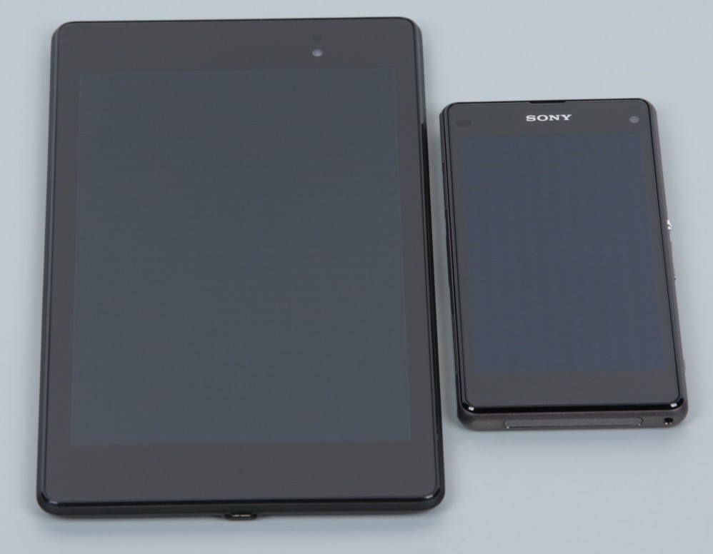 Экран смартфона прикрыт стеклянной пластиной, на которую фабричным способом наклеена пластиковая зеркально-гладкая защитная пленка, относительно устойчивая к появлению царапин, но все же менее твердая, чем неорганическое стекло. В итоге через некоторое время эксплуатации экран обязательно покрывается царапинами. Впрочем, скорее всего, при некотором старании эту пленку можно отделить и заменить на новую, совместимую. Фабричная защитная пленка обладает достаточно выраженными олеофобными (жироотталкивающими) свойствами (но у Google Nexus 7 (2013) — далее мы сравниваем именно с ним — олеофобное покрытие немного эффективнее), поэтому следы от пальцев удаляются легче, а появляются с меньшей скоростью, чем в случае обычного стекла. Судя по отражению объектов, имеется действенный антибликовый фильтр, который по снижению яркости отражения не хуже, чем у Nexus 7. Для наглядности приведем фотографию, на которой в выключенных экранах отражается белая поверхность (слева — Nexus 7, справа — Sony Xperia Z1 Compact, далее их можно различать по размеру):