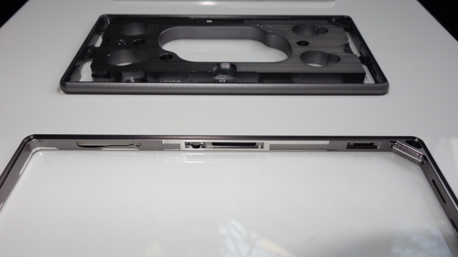 В принципе, читатели, следящие за тем, что происходит на рынке мобильных устройств, прекрасно понимают, о чем идет речь, когда разговор заходит о необычности дизайна оригинального смартфона Xperia Z. Там, согласно дизайн-концепции OmniBalance, в рамку из шершавого на ощупь композитного материала были со всех сторон впаяны плоские панельки, которые действительно имели зеркальные свойства, хотя часть из них была выполнена не из стекла (речь идет о боковых гранях). Примерно такой же образ был воссоздан и в облике новинок Xperia Z1 и Z Ultra, только теперь все это полностью сформовано из настоящего металла, и зеркальных свойств, естественно, не имеет. То есть, имеется, как бы, и рамка, и плоские панельки, но вырезано это все методом фрезерования из цельного куска алюминия. Этот металлический ободок, кстати, по совместительству исполняет еще и роль антенны. Этапы процесса обработки данной металлической детали, включающего, кстати, и двойное анодирование алюминия, наглядно демонстрировались во время презентации на отдельном стенде.