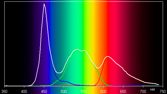 Цветовой баланс неидеальный, так как отклонение от спектра абсолютно черного тела (дельта Е) не очень велико, но цветовая температура и дельта Е заметно меняются от оттенка к оттенку на шкале серого, что отрицательно сказывается на визуальной оценке цветового баланса. (Темные области шкалы серого можно не учитывать, так как там баланс цветов не имеет большого значения, да и погрешность измерений цветовых характеристик на низкой яркости большая.)