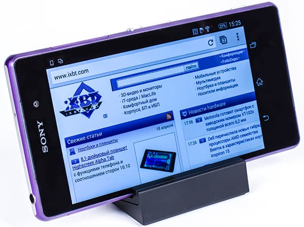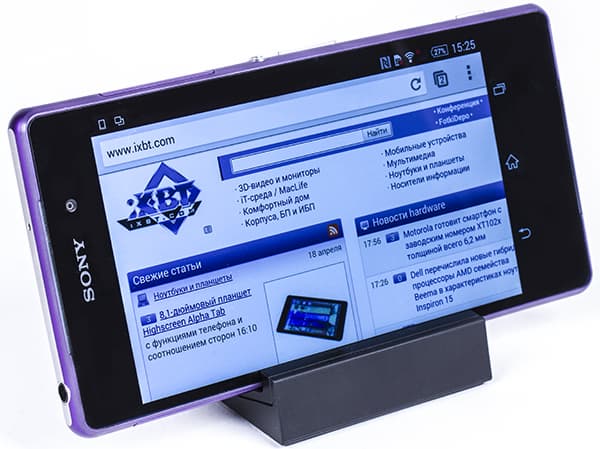 Штатное зарядное устройство имеет выходной ток 1,5 А, наше тестирование показало, что за полчаса аппарат заряжается примерно до 25%, за час — до 45%, а полная зарядка батареи происходит в течение приблизительно 3 часов. В этом плане никаких особых рекордов аппараты Sony не бьют: например, новинка Oppo Find 7a — та действительно заряжается всего за 1 час 10 минут, но там выходной ток у комплектного зарядного устройства составляет 4,5 А.