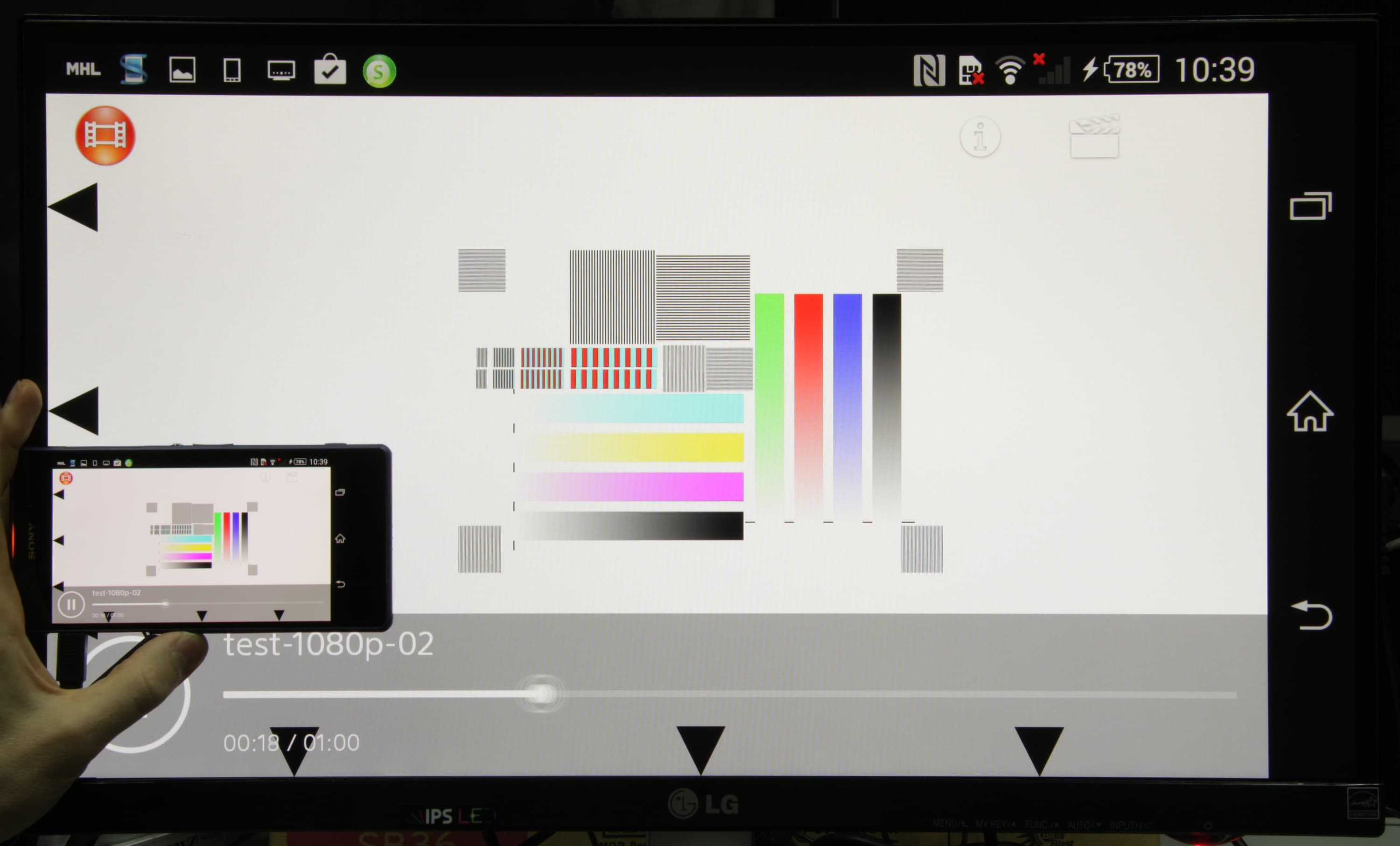 С подключенным по MHL монитором при воспроизведении видео на мониторе отображается точная копия экрана смартфона, то есть вывод осуществляется в истинном разрешении Full HD в случае файлов 1080p. Отображаемый на мониторе диапазон яркости равен стандартному диапазону 16—235 — в тенях и в светах отображаются все градации оттенков. Результаты тестов вывода на монитор приведены в таблице выше в блоке «MHL (вывод на монитор)». Для файлов с 50 и 60 кадр/с мы использовали внешний адаптер, обеспечивший вывод с частотой 60 кадр/с, но с разрешением 720p. Качество вывода очень хорошее.