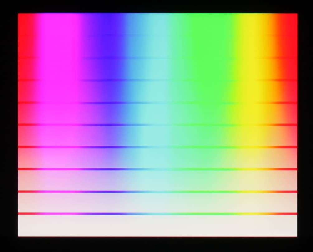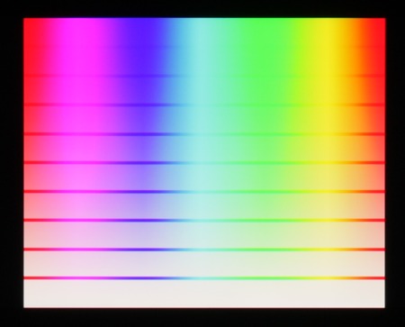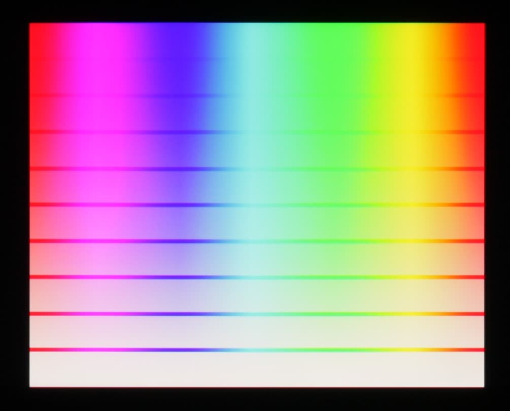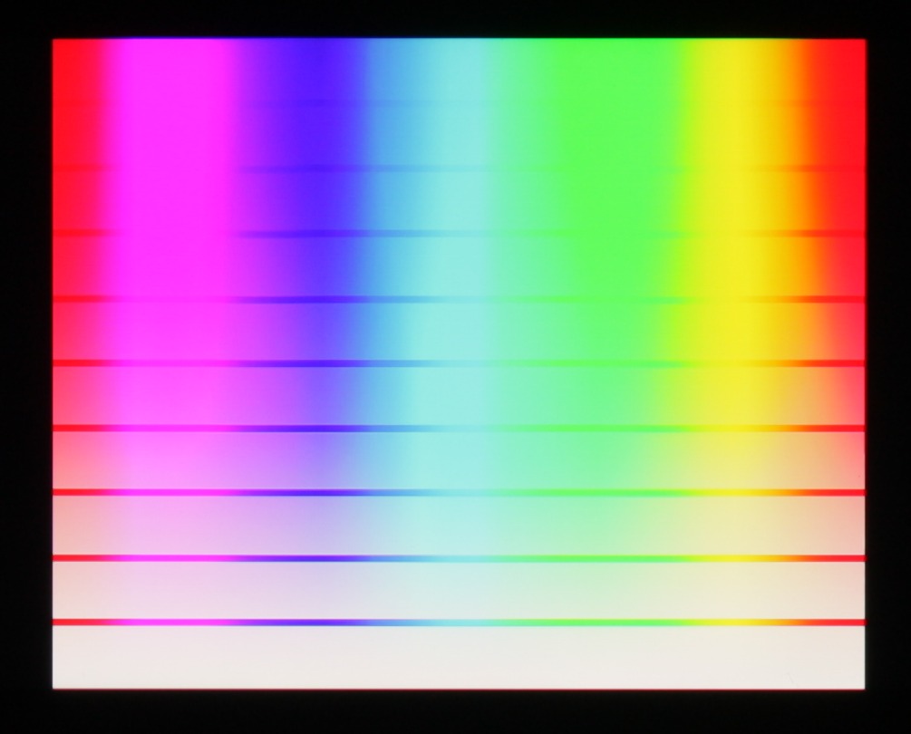 Баланс оттенков на шкале серого хороший, так как цветовая температура близка к стандартным 6500 К, и отклонение от спектра абсолютно черного тела (ΔE) меньше 10, что для потребительского устройства считается приемлемым показателем. При этом вариация цветовой температуры и ΔE небольшая, что также положительно сказывается на визуальном восприятии цветового баланса. (Темные области шкалы серого можно не учитывать, так как там баланс цветов не имеет большого значения, да и погрешность измерений цветовых характеристик на низкой яркости большая.)