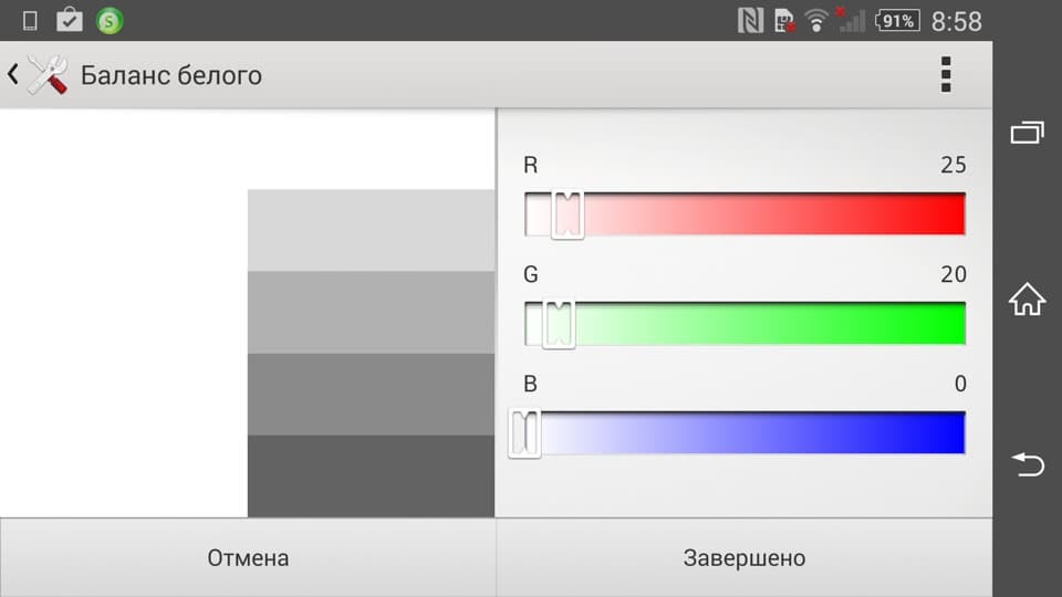 В этом смартфоне есть возможность подправить цветовой баланс регулировкой интенсивности трех основных цветов.