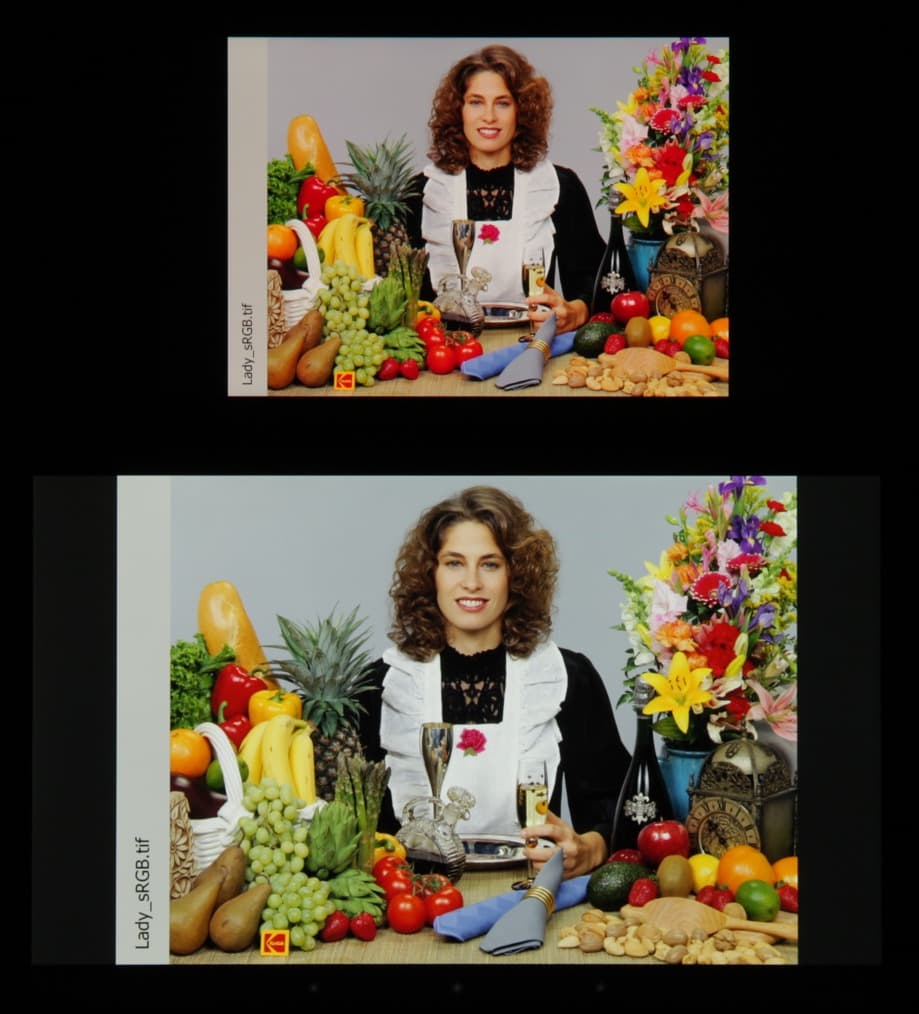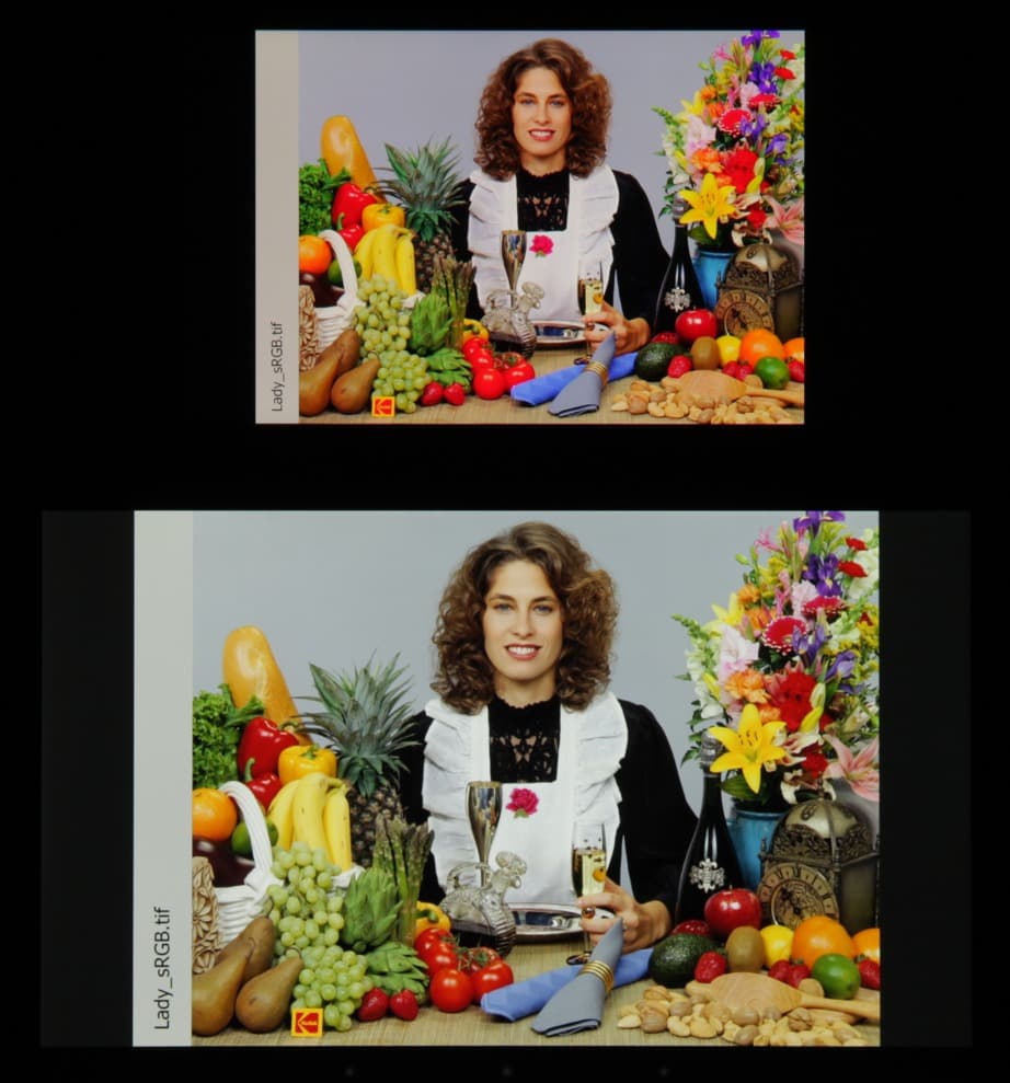 Что мы и попытались сделать, результат — данные, подписанные как Корр. на графиках выше. В итоге мы на белом немного уменьшили ΔE и чуть больше приблизили точку белого к 6500 К. При этом, судя по уменьшенной интенсивности красного, на изображении стало чуть меньше красноты. Впрочем, перенасыщенность цветов такая коррекция не уменьшила.