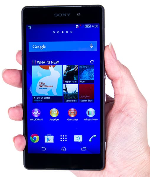 Смартфон ощущается очень большим и тяжелым монолитным бруском, в нем нет той «воздушности», которая чувствуется в пластиковых корпусах Samsung, и нет той гладкой обтекаемости приятного на ощупь металла, что есть у HTC One. В общем, корпус у новой Xperia Z2 достаточно грубый, и с этим ничего уже не поделаешь. Зачем здесь убрали смягчающие контакт с ладонью пластмассовые прокладки между стеклом и металлом — остается загадкой.