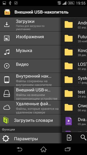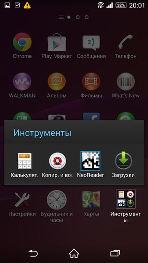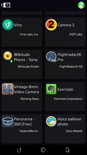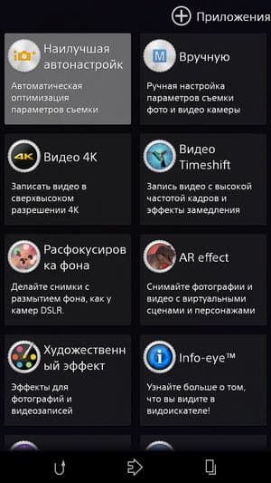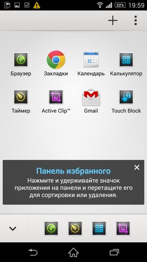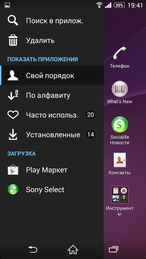 Основная отличительная черта меню программ — широкие возможности по сортировке, выборке и работе с иконками установленных приложений. Для работы с ними здесь появилась даже целая контекстная панель, выдвигающаяся слева боковым взмахом. В ней можно осуществлять поиск по категориям, задавать свое собственное, произвольное расположение иконок либо отсортировать их несколькими предусмотренными способами. Очень удобно, что прямо здесь же можно и удалить любое приложение без необходимости заходить в специальный раздел основного меню — функциональность, частично заменяющая файловый менеджер. Естественно, поддерживается возможность создания папок, но для этого нужно содержать иконки в режиме «свой порядок», иначе все рассортированные по папкам приложения опять распределятся по рабочим столам — например, в алфавитном порядке. Новую выдвигающуюся панель мы впервые встретили у мини-флагмана Sony Xperia Z1 Compact, теперь она появилась у всех топовых моделей Sony с обновлением прошивки.