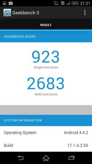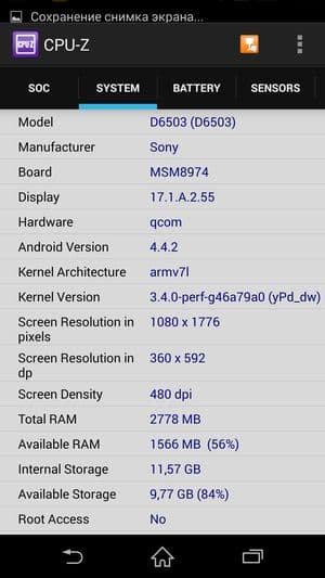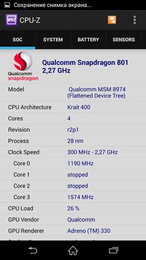 Как и у новых флагманов Samsung и HTC, аппаратная платформа Sony Xperia Z2 строится на базе новейшей однокристальной четырехъядерной системы (SoC) Qualcomm Snapdragon 801 с четырьмя ядрами Krait 400. Напомним, что новая платформа обладает функциональностью Snapdragon 800 с чуть большей частотой процессорных ядер: Snapdragon 801 может работать на частотах до 2,45 ГГц, в то время как частота ядер предыдущей версии чипа была ограничена на уровне 2,36 ГГц. Правда, у Sony Xperia Z2, как и в случае HTC One (M8), максимальная частота процессорных ядер составляет лишь 2,3 ГГц (CPU-Z показывает 2,27 ГГц), что меньше, чем у Samsung Galaxy S5 (2,46 ГГц). Объясняется это тем, что здесь используется немного другая версия Qualcomm Snapdragon 801 (MSM8974AB). В отличие от версии MSM8974AC, которая установлена в Samsung Galaxy S5, здесь максимально возможная частота CPU ограничена 2,36 ГГц, а частота GPU равна 550 МГц (для MSM8974AC эти характеристики составляют 2,45 ГГц и 578 МГц соответственно). Таким образом, из трех самых свежих новинок, представленных на платформе Qualcomm Snapdragon 801 топовыми производителями, лишь аппарат Samsung работает на максимальной версии данной платформы — другие два, Sony Xperia Z2 и HTC One (M8) оснащены чуть менее производительной платформой из новой серии.