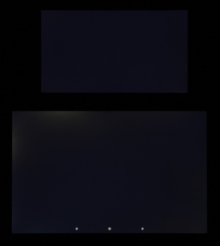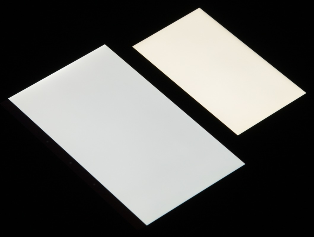 Яркость под углом у обоих экранов заметно уменьшилась (как минимум в 4 раза, исходя из разницы в выдержке), но в случае Sony Xperia Z2 падение яркости меньше (яркость по фотографиям 237 против 217 у Nexus 7). При этом цветовой тон изменился несильно. Черное поле при отклонении по диагонали высветляется слабо и приобретает красно-фиолетовый оттенок или остается почти нейтрально-серым. Фотографии ниже это демонстрируют (яркость белых участков в перпендикулярном плоскости экранов направлении у экранов одинаковая!):