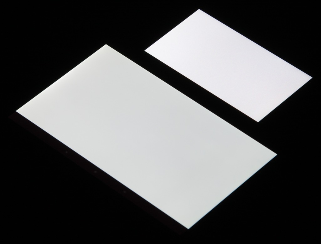 Экран имеет хорошие углы обзора без инвертирования оттенков и без значительного сдвига цветов даже при больших отклонениях взгляда от перпендикуляра к экрану. Для сравнения приведем фотографии, на которой на экраны Nexus 7 и Sony Xperia Z3 Compact выведены одинаковые изображения, при этом яркость экранов изначально установлена примерно на 200 кд/м² (по белому полю во весь экран), а цветовой баланс на фотоаппарате принудительно переключен на 6500 К. Перпендикулярно к плоскости экранов белое поле: