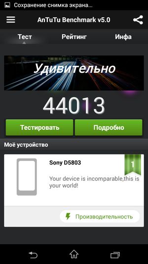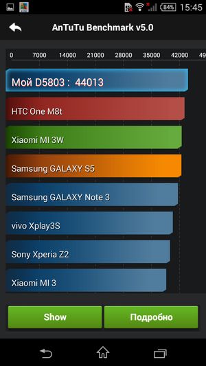 В тесте AnTuTu смартфон демонстрирует очень высокие показатели цифры, но тут стоит учитывать, что теперь используется новая, пятая версия популярного бенчмарка, а все предыдущие модели проходили тестирование в четвертой версии. Результирующие цифры сильно увеличились, так что напрямую сравнивать такие результаты не стоит. (Мы будем помечать в табличках, какими версиями бенчмарка тестировалась та или иная модель, пока для сравнения вновь не наберется достаточно моделей, протестированных в пятой версии теста.) В любом случае все топовые смартфоны, работа которых основана на Snapdragon 801 — это максимально мощные и производительные на сегодняшний день мобильные аппараты, мощности которых еще долго будет хватать для выполнения любых поставленных задач.
