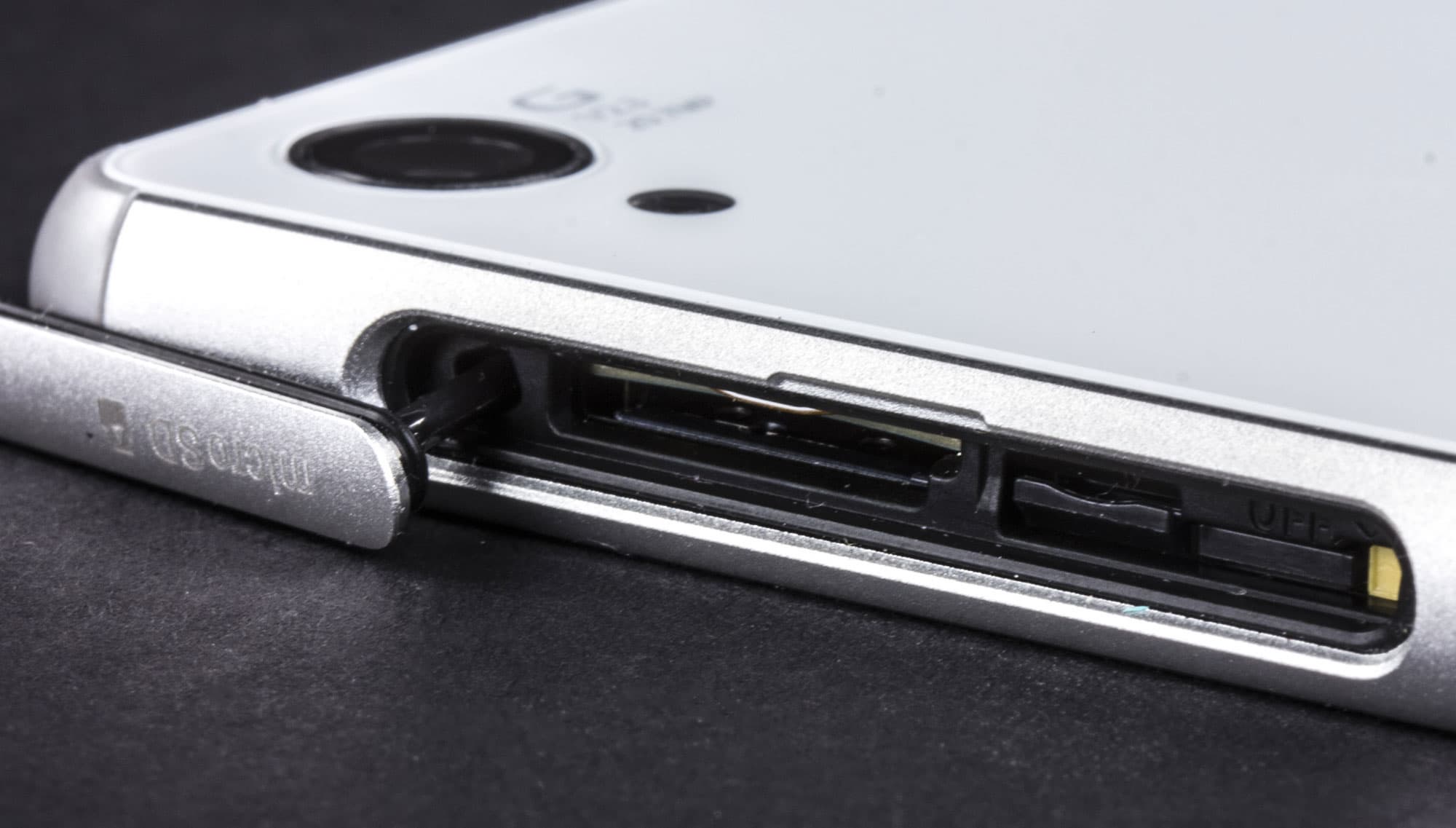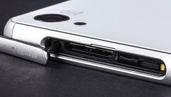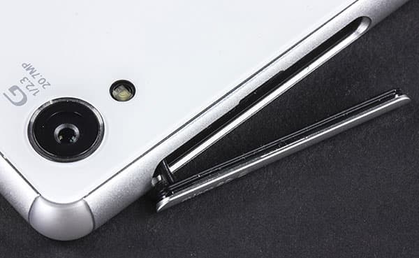 Крышки на боковой рамке все так же выполнены из металла и снабжены прорезиненными прокладками. В итоге смартфон, как и его предшественники, обеспечен максимальной защитой от попадания внутрь воды и пыли по стандарту IP 65/68. Крышек две, они скрывают под собой слоты для карты памяти и SIM-карты, а также разъем Micro-USB. Кстати, изменения произошли и тут: теперь в топовых мобильных аппаратах Sony используются карточки формата Nano-SIM, очевидно с прицелом на безболезненный возможный переход некоторых пользователей с Apple iPhone. Остальным же придется снова идти в салон связи и менять свою SIM-карту на карточку нового стандарта.