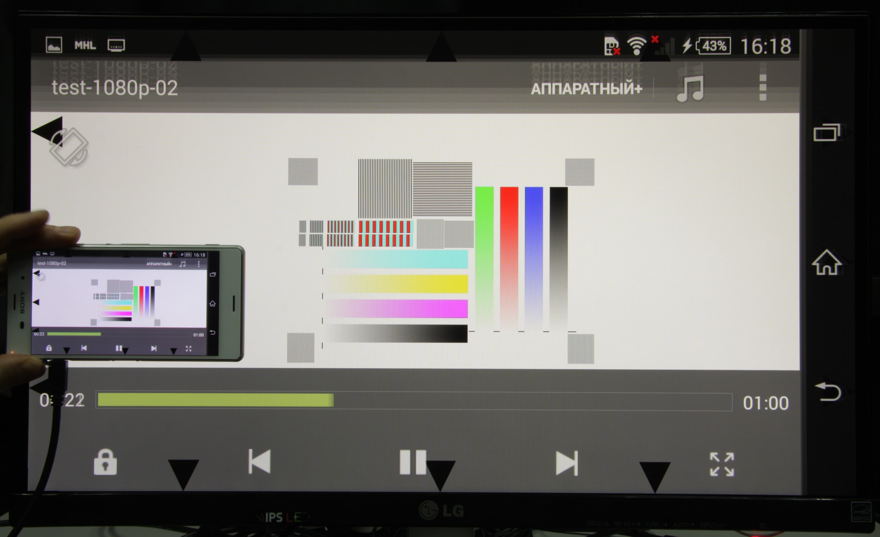 С подключенным по MHL монитором при воспроизведении видео на мониторе отображается точная копия экрана смартфона, то есть вывод осуществляется в истинном разрешении Full HD в случае файлов 1080p.