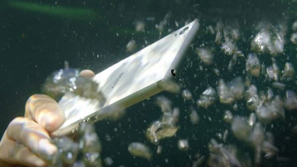 В нижней части правой грани располагается выделенная аппаратная клавиша управления камерой, за счет нее смартфон можно использовать для съемки даже под водой, хотя экран в это время становится нечувствителен к прикосновениям. Возможность съемки на мобильные устройства Sony под водой — это такая фирменная «фишка», постоянно обыгрываемая компанией в рекламе и на постерах.