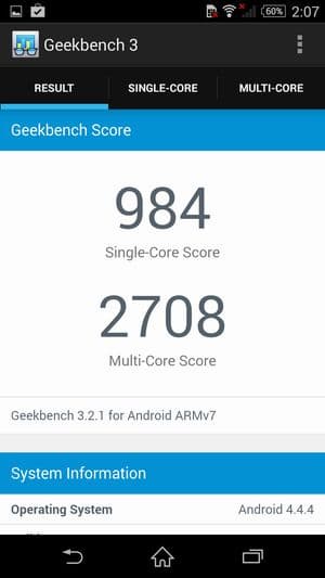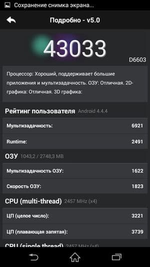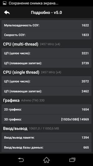 По результатам тестирования в бенчмарках аппарат показал себя одним из самых мощных и производительных современных мобильных аппаратов на рынке. Стоит заметить, что все цифры практически совпали с результатами предыдущей модели Sony Xperia Z2, не так давно проходившей точно такие же тесты. Что же касается рельтатов в тесте AnTuTu, то они сильно увеличились, однако не совсем пока понятно, как результаты двух версий популярного бенчмарка коррелируют между собой, ведь теперь на смену четвертой версии пришла пятая, и все новые аппараты отныне тестируются в ней. Привели ли разработчики все к общему знаменателю, неизвестно, так что пока придется помечать в табличках какими версиями бенчмарка тестировалась та или иная модель. Впрочем, наверняка, разница не столь уж велика, все топовые смартфоны, работа которых основана на Snapdragon 801, это, в любом случае, наиболее мощные на сегодняшний день мобильные аппараты на рынке, аппаратных мощностей которых еще долго будет хватать для выполнения любых поставленных задач.