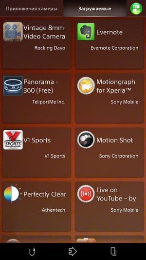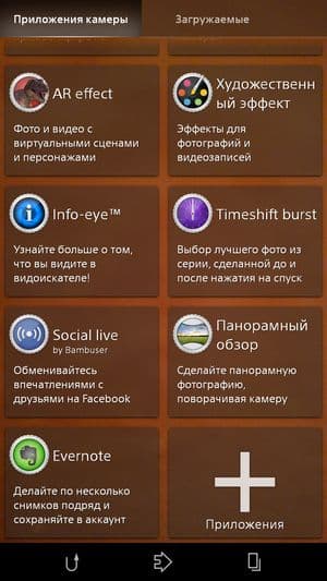 Помимо автоматического и ручного, у ПО камеры Sony Xperia Z3 есть еще несколько любопытных дополнительных режимов съемки. Режим Info-eye, например, подставляет контекстную информацию к объекту в кадре с использованием технологии дополненной реальности. В режиме Timeshift burst камера за две секунды до нажатия кнопки спуска затвора делает до 61 снимка, из которых потом можно выбрать лучший. Функция Social live позволяет загружать отснятые материалы сразу на Facebook и просматривать комментарии к ним на экране смартфона. AR effect дает возможность совмещать снимки с анимацией с использованием фирменной технологии дополненной реальности SmartAR. Кроме того, набор дополнительных приложений, увеличивающих выбор различных режимов съемки, можно расширить за счет закачиваемых приложений, число которых постоянно пополняется. Для этого нужно просто включить камеру, нажать значок выбора режима съемки и выбрать «+Приложения» для просмотра дополнительных вариантов.