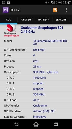 - SoC Qualcomm Snapdragon 801 (MSM8974AC), 2,5 ГГц, 4 ядра