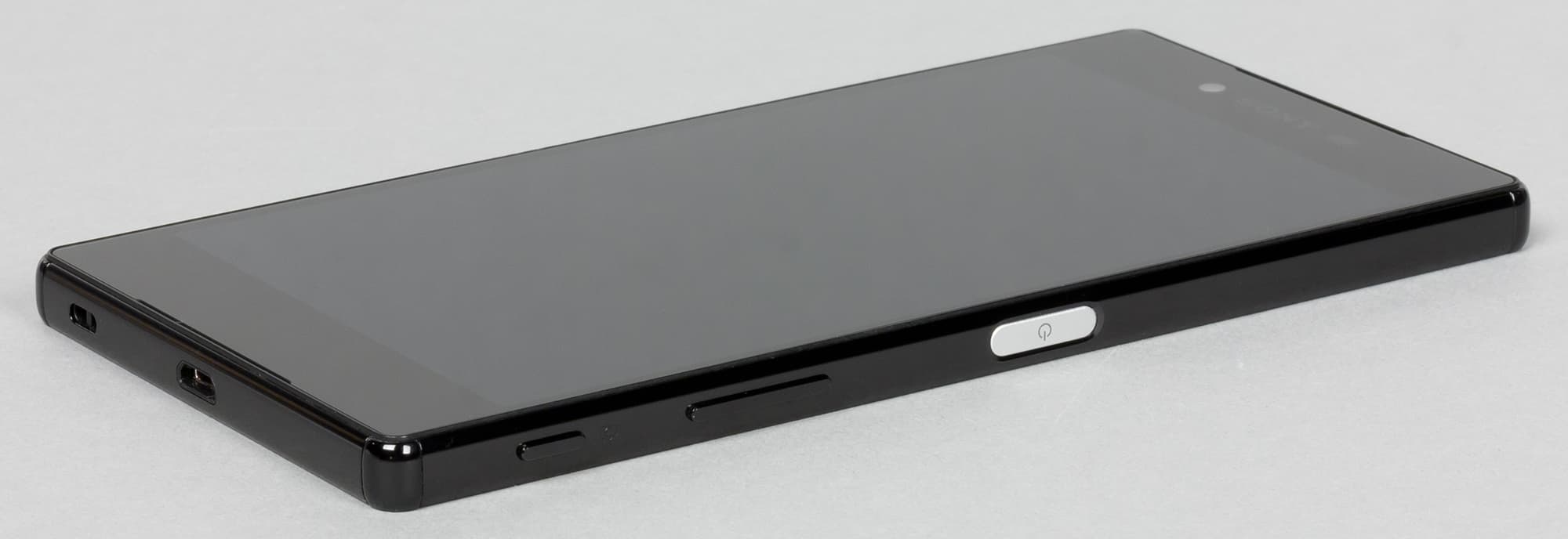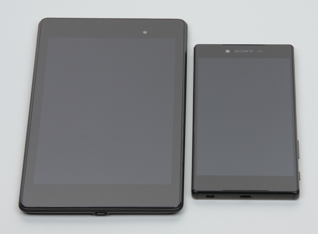 Лицевая поверхность экрана выполнена в виде стеклянной пластины с зеркально-гладкой поверхностью, устойчивой к появлению царапин. Судя по отражению объектов антибликовые свойства экрана чуть лучше, чем у экрана Google Nexus 7 (2013) (далее просто Nexus 7). Для наглядности приведем фотографию, на которой в выключенных экранах обоих устройств отражается белая поверхность (Sony Xperia Z5 Premium, как нетрудно определить, справа, далее их можно различать по размеру):