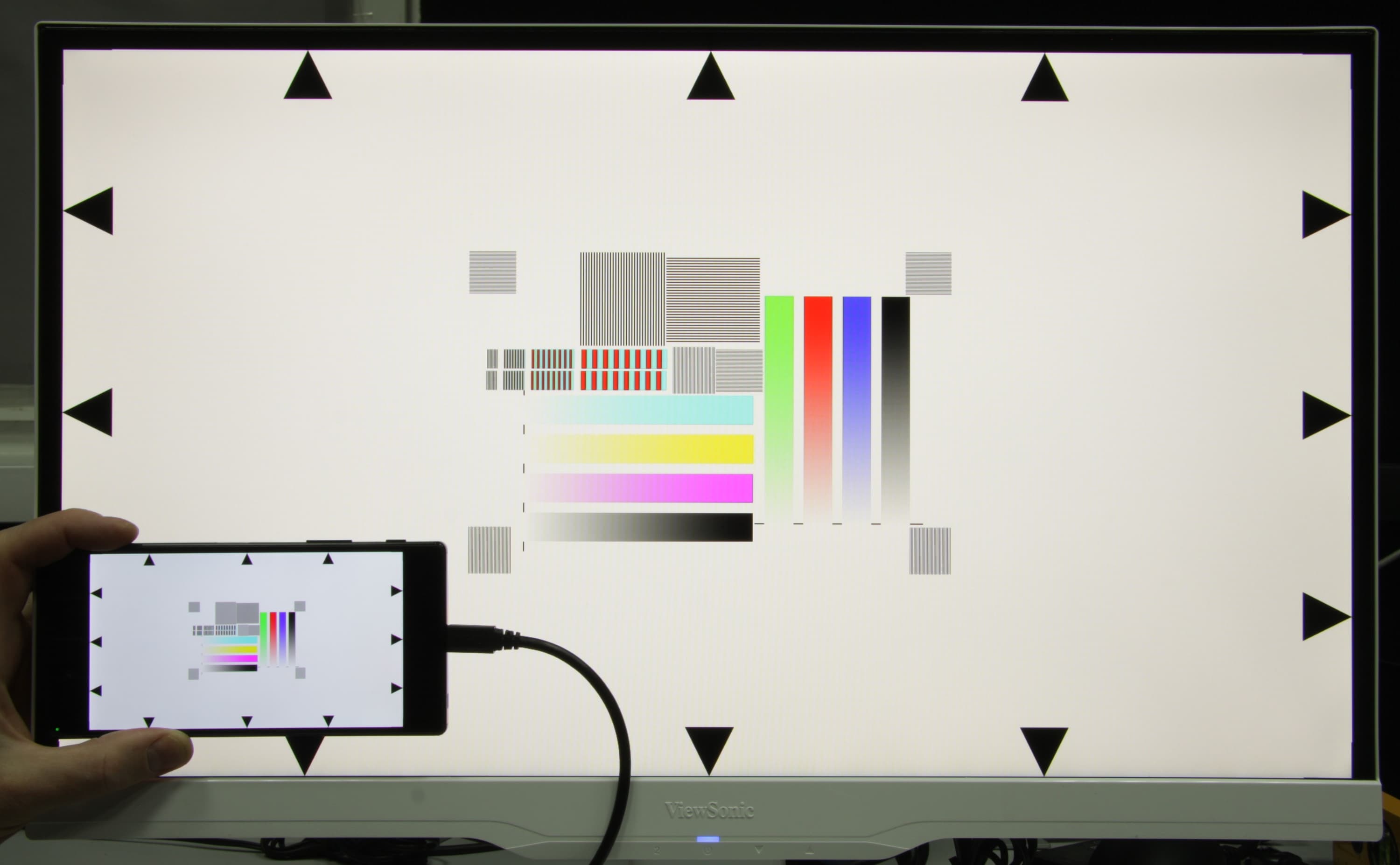 Дополнительные тесты показали, что в принципе далеко не каждое приложение вообще способно выводить изображение в этом условном 4К-разрешении. Например, MX Player, FIV, Google Photos осуществляют вывод исключительно в разрешении Full HD, то есть 1920 на 1080 пикселей (до разрешения экрана масштабирует уже сам смартфон), и только демонстратор изображений самой Sony выводит картинку в разрешении 4К (возможно, и штатный видеоплеер Sony тоже умеет это делать). Вот такое ограниченное «4К», не для всех. Хорошо, программу нашли, рассмотрим особенности вывода на примере вертикальной и горизонтальной миры с черными полосками толщиной в один пиксель через белый промежуток тоже в один пиксель. Исходное тестовое изображение доступно по этой ссылке, мира находится в центре. Вот ее фрагмент: