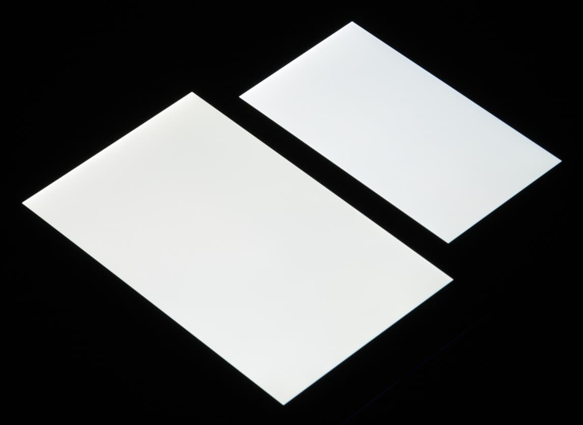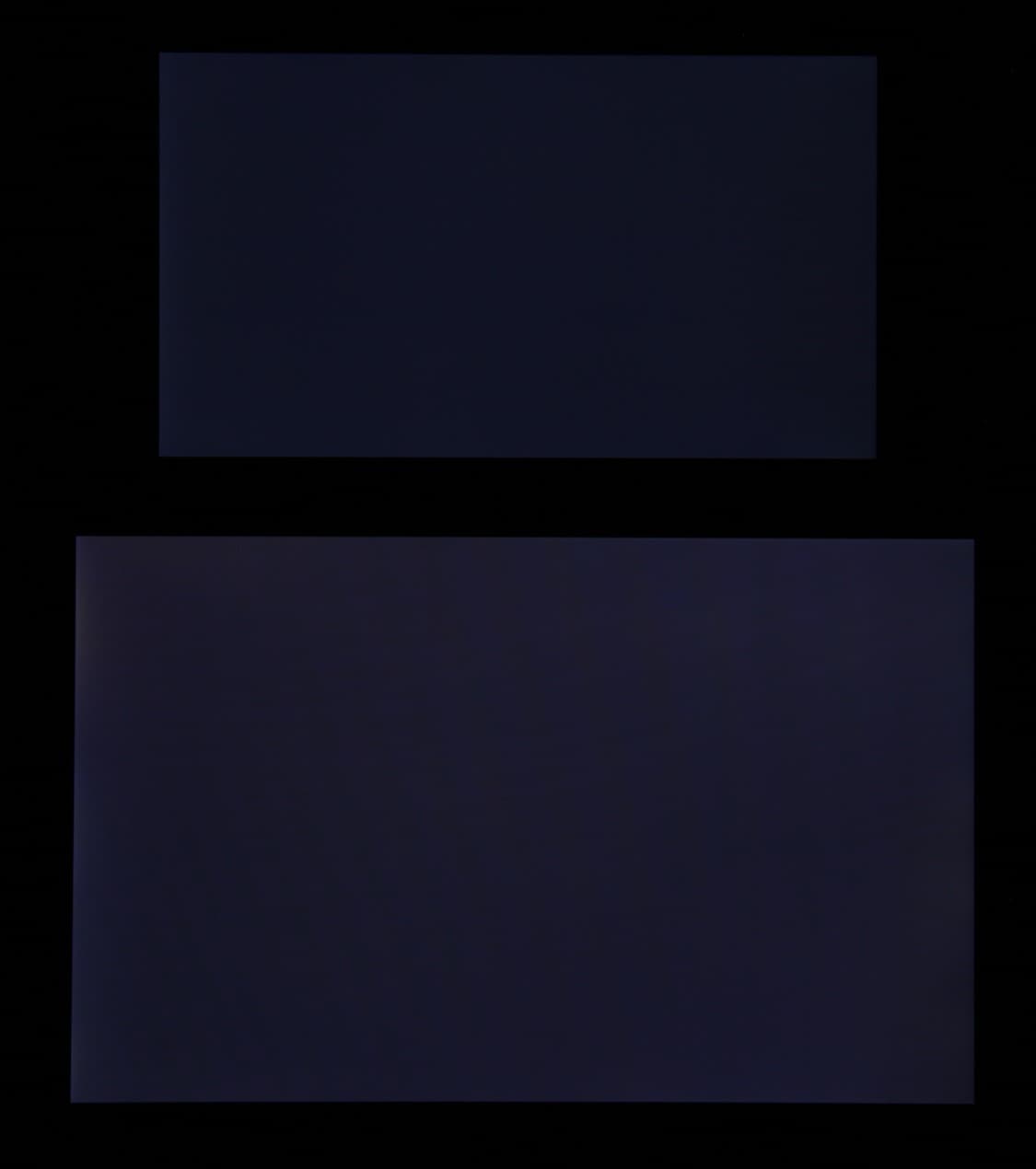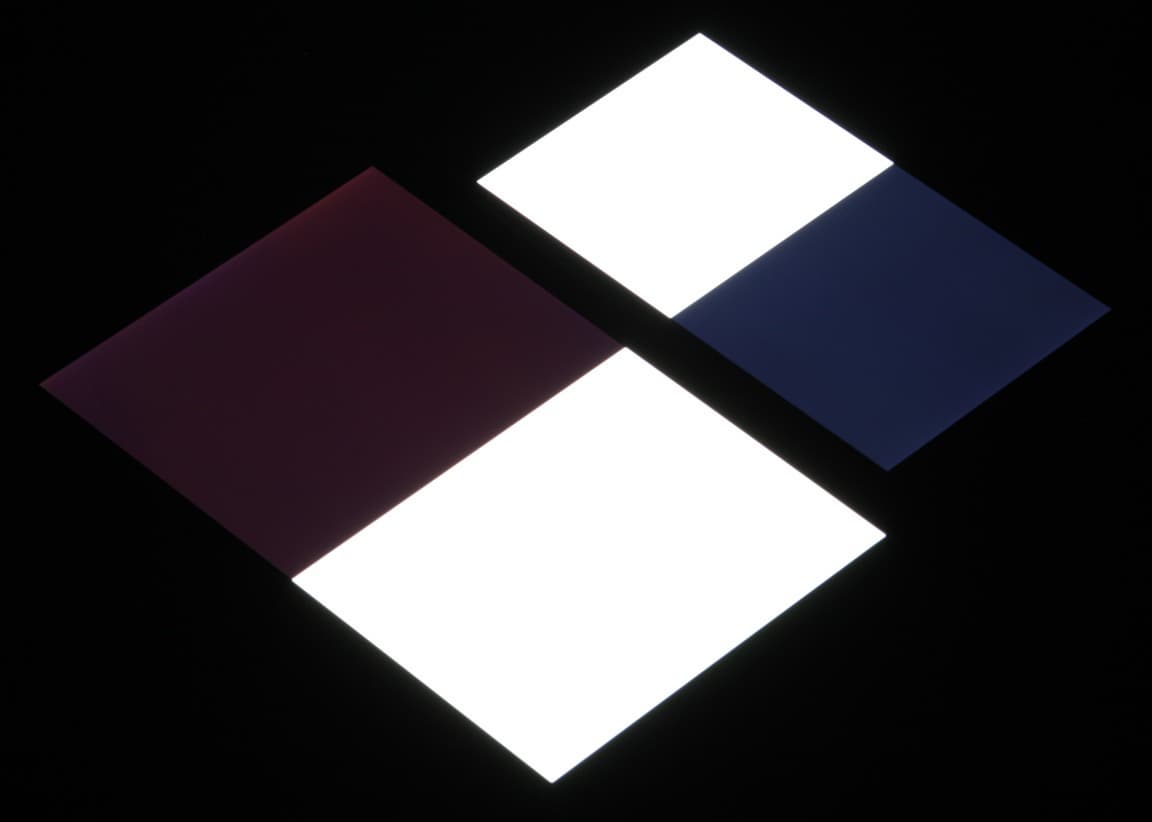 Яркость под углом у обоих экранов заметно уменьшилась (как минимум в 5 раз, исходя из разницы в выдержке), но в случае Sony Xperia Z5 Premium падение яркости чуть больше (яркость по фотографиям 232 против 235 у Nexus 7). Черное поле при отклонении по диагонали высветляется не очень сильно и приобретает фиолетовый оттенок. Фотографии ниже это демонстрируют (яркость белых участков в перпендикулярном плоскости экранов направлении у экранов одинаковая!):