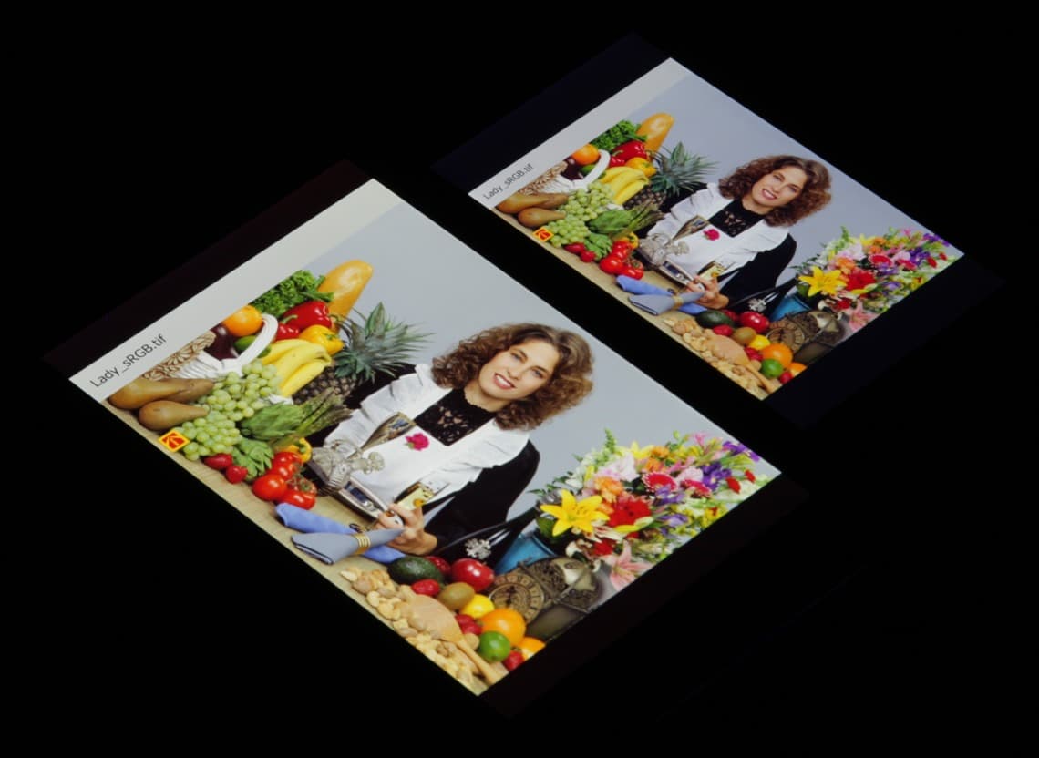 Они очень нетипичные для топовых мобильных устройств Sony. По всей видимости, в этом экране используются светодиоды с синим излучателем и зеленым и красным люминофором (обычно — синий излучатель и желтый люминофор), что в сочетании со специальными светофильтрами матрицы и позволяет получить широкий цветовой охват. В красном люминофоре, видимо, используются так называемые квантовые точки. К сожалению, в итоге цвета изображений — рисунков, фотографий и фильмов, — ориентированных на пространство sRGB (а таких подавляющее большинство), имеют неестественную насыщенность. Особенно это заметно на узнаваемых оттенках, например на оттенках кожи. Результат приведен на фотографии выше.